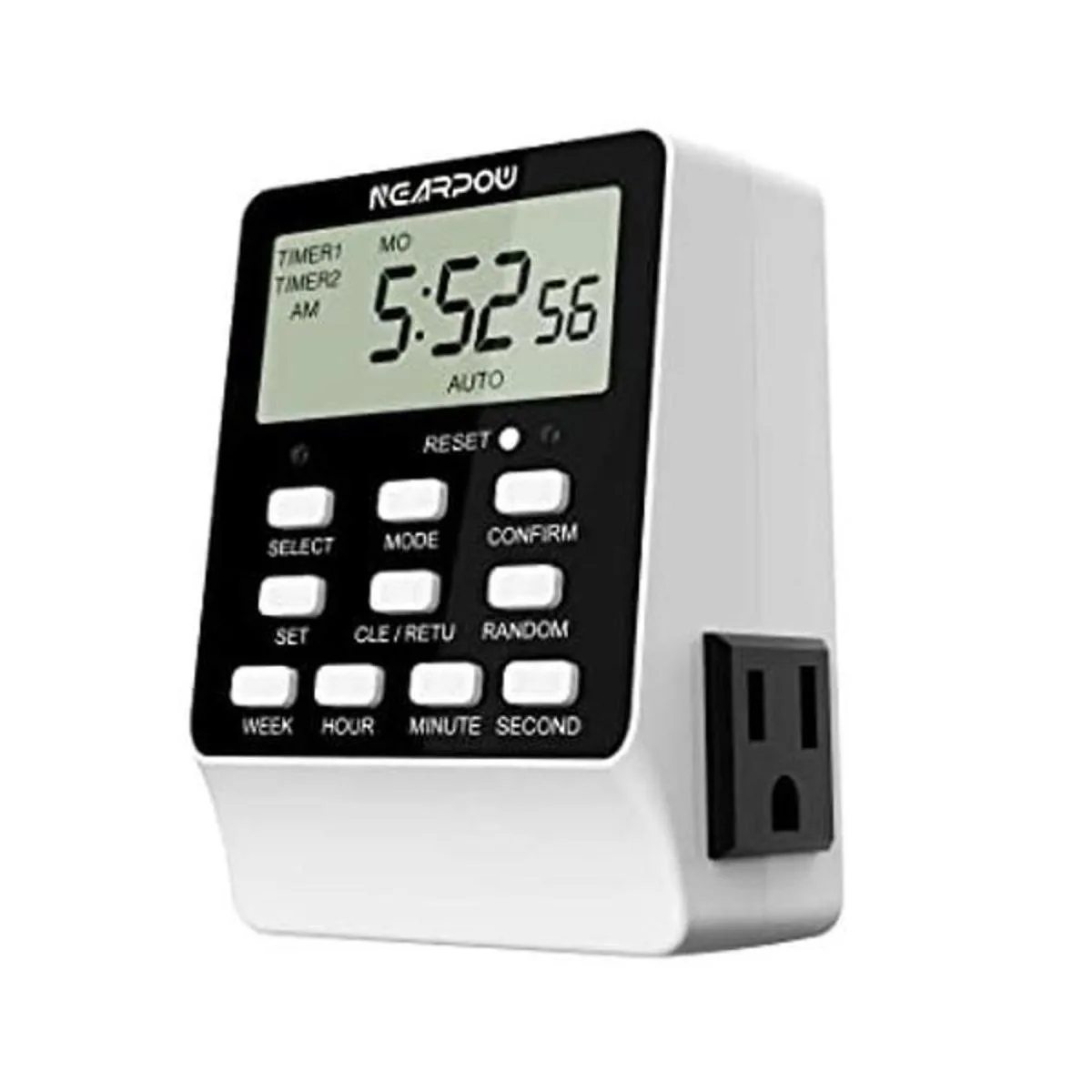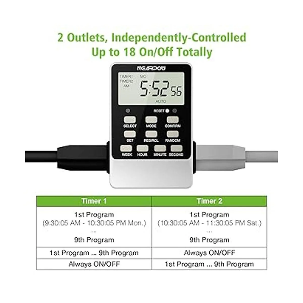 Temporizador de toma, temporizador de luz digital dual NEARPOW con 2 tomas de corriente controladas independientemente, 18 programas de encendidoapagado, programable de 24 horas y 7 días, interruptor de temporizador eléctrico resistente para interiores, 3 puntas, 15A1800W