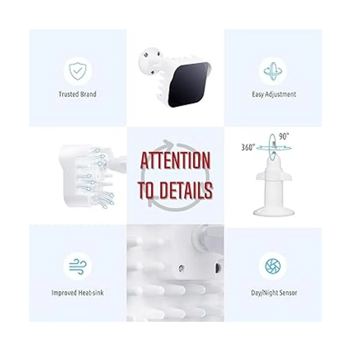 Redefiniendo la iluminación uniforme: con la lente integrada de diseño a medida, las luces IR se extienden de forma más eficiente y uniforme en el campo de visión de tu cámara. No más imágenes hotspot y lavadas.