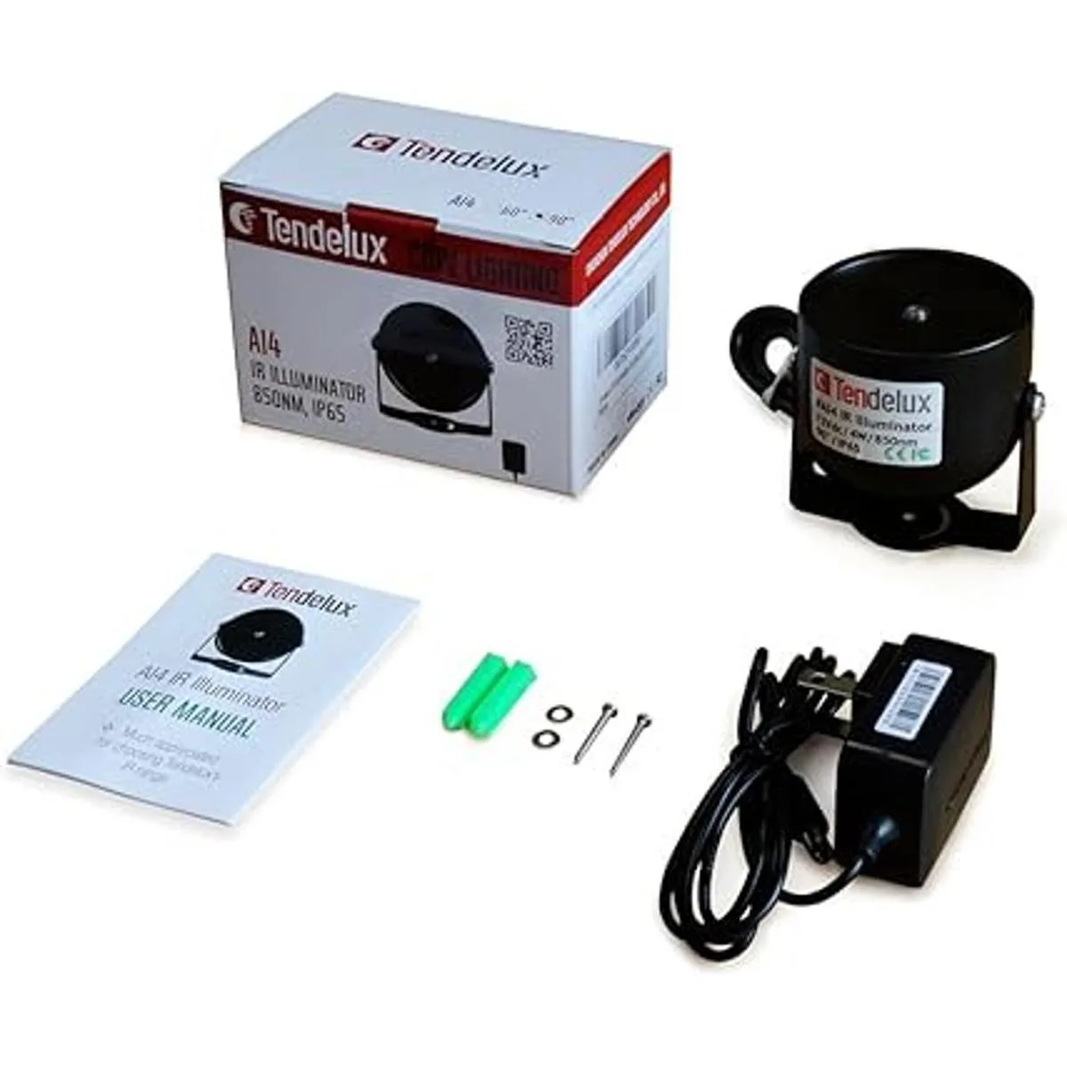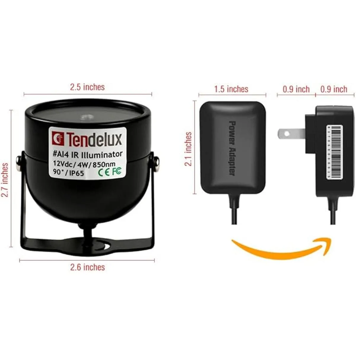 Lo que obtienes: 1 iluminador infrarrojo de 4 W, 1 adaptador de corriente Plug and Play de 12 V CC 0,5 A, tornillos de instalación, 1 manual de usuario idioma español no garantizado. Aviso: el adaptador puede diferir del de las imágenes debido a la disponibilidad, Tendelux será 100 responsable de cualquier problema de calidad