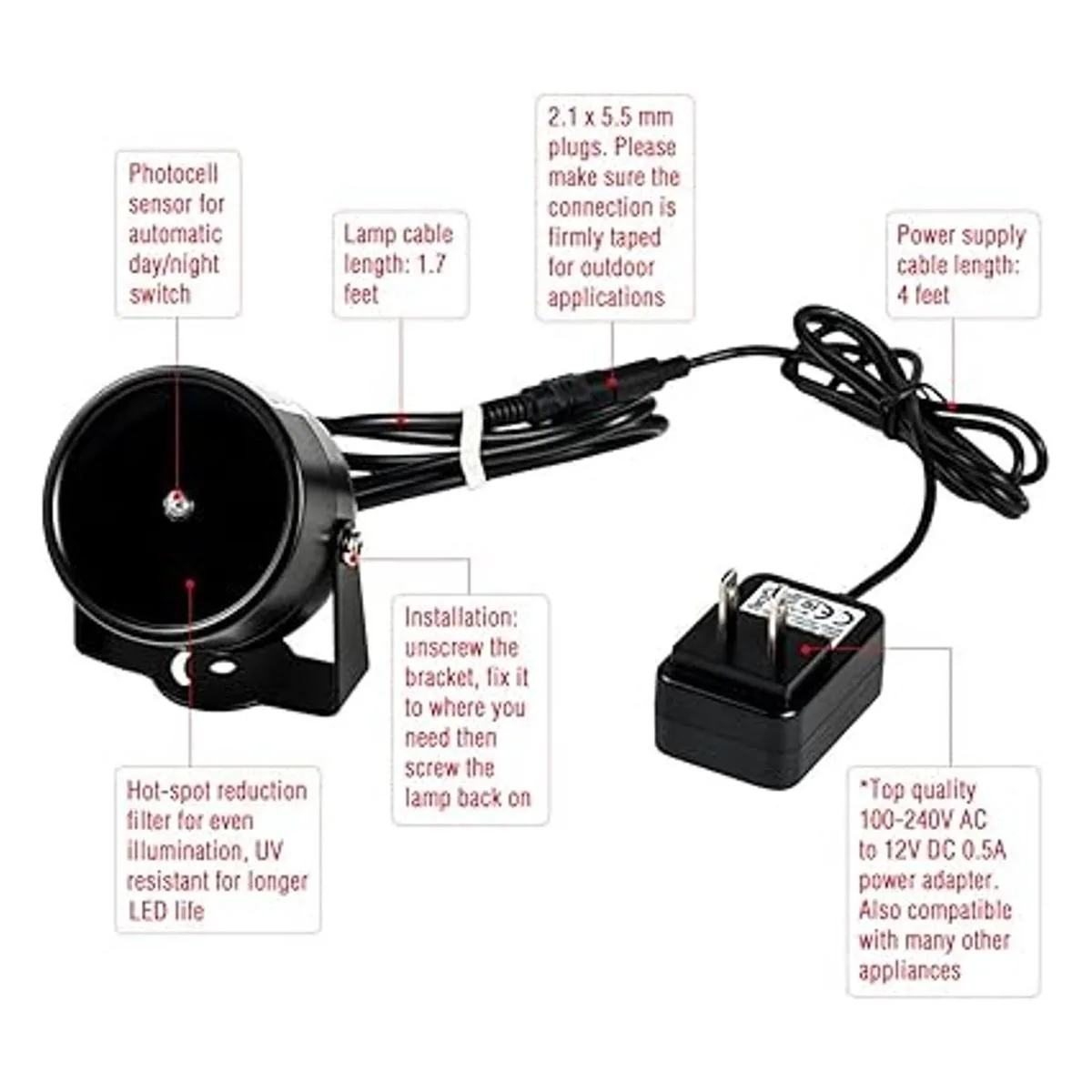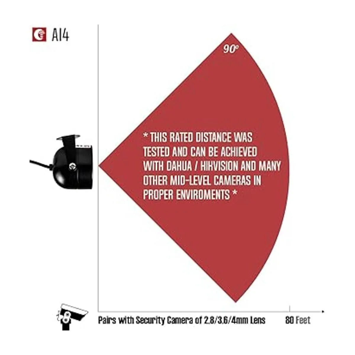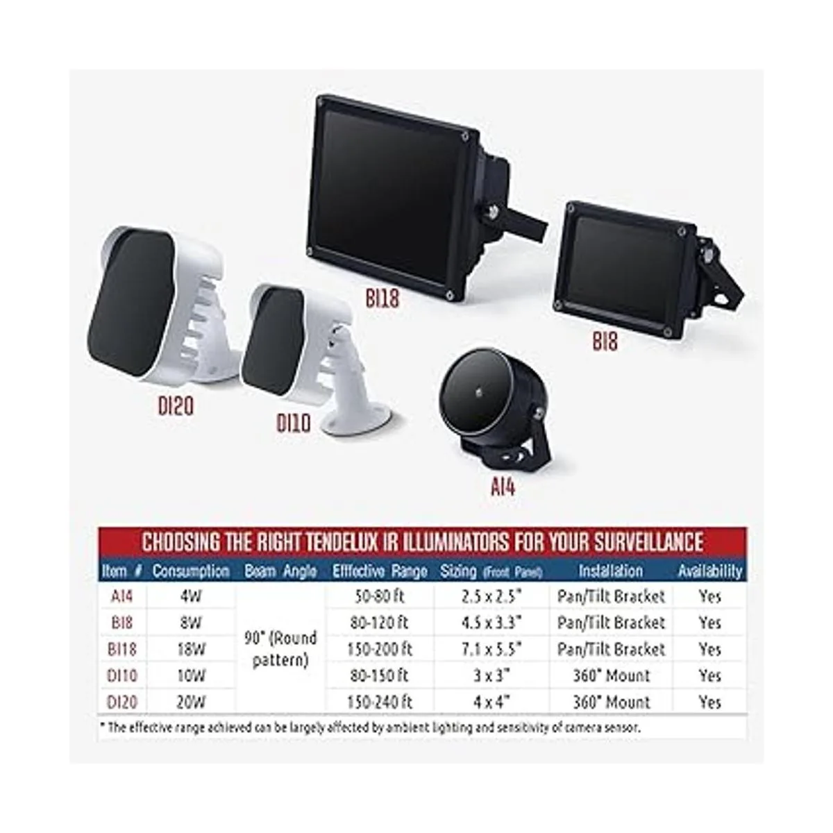 Tendelux Iluminador IR de 80 pies Luz infrarroja de gran angular sin punto caliente AI4 para cámara de seguridad con adaptador de corriente