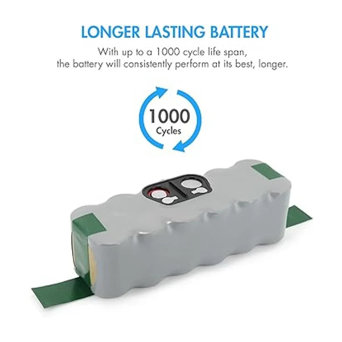 Actualización y reemplazo: un sistema de limpieza es tan fuerte como la batería lo permite. Obtén la potente batería Roomba de 14.4 V como un reemplazo directo de la unidad estándar interna. Con una capacidad nominal de 3850 mAh, almacena más energía, lo que significa tiempos de funcionamiento más largos dependiendo del uso. Compatible con estos modelos seleccionados iRobot 500, 510, 530, 532, 535, 536, 540, 550, 551, 562, 570, 572, 580, 590, 610, 760, 770, 780, 880, 960 y 980. .