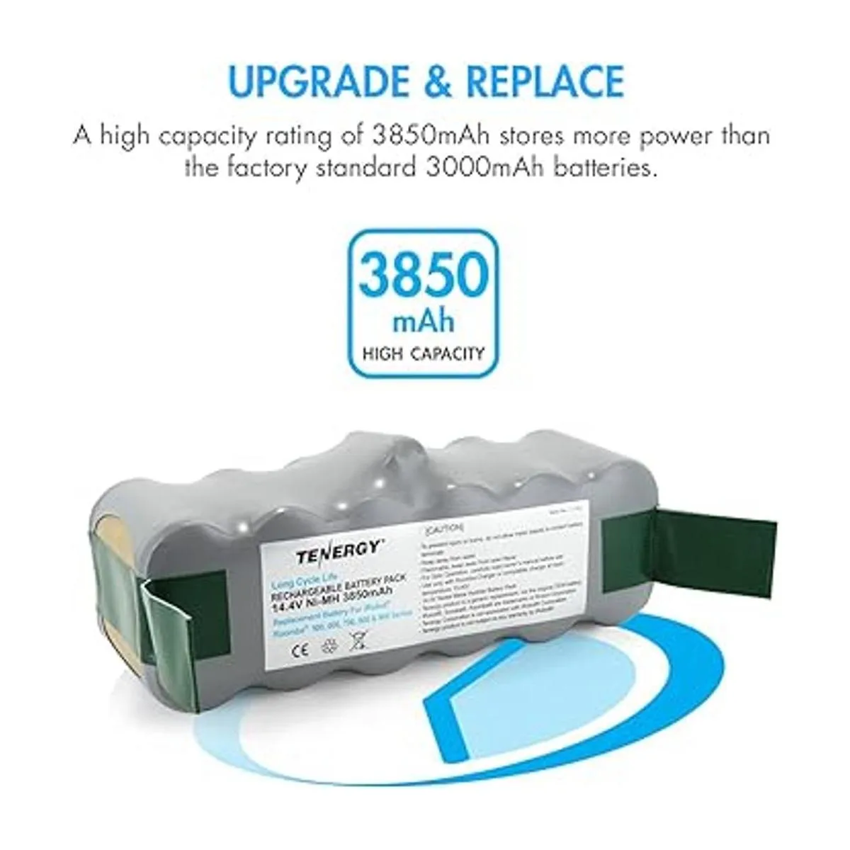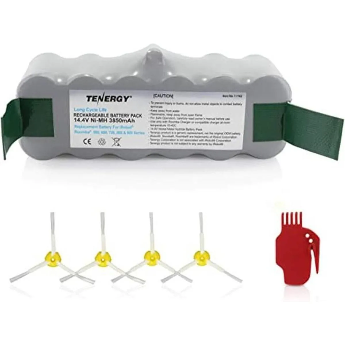 Tenergy Batería NiMH de 1000 ciclos de 14.4 V 3850 mAh para iRobot Roomba 900 800 700 600 500 Series, baterías de repuesto recargables al vacío, 4 cepillos laterales y 1 herramienta de limpieza de cepillo