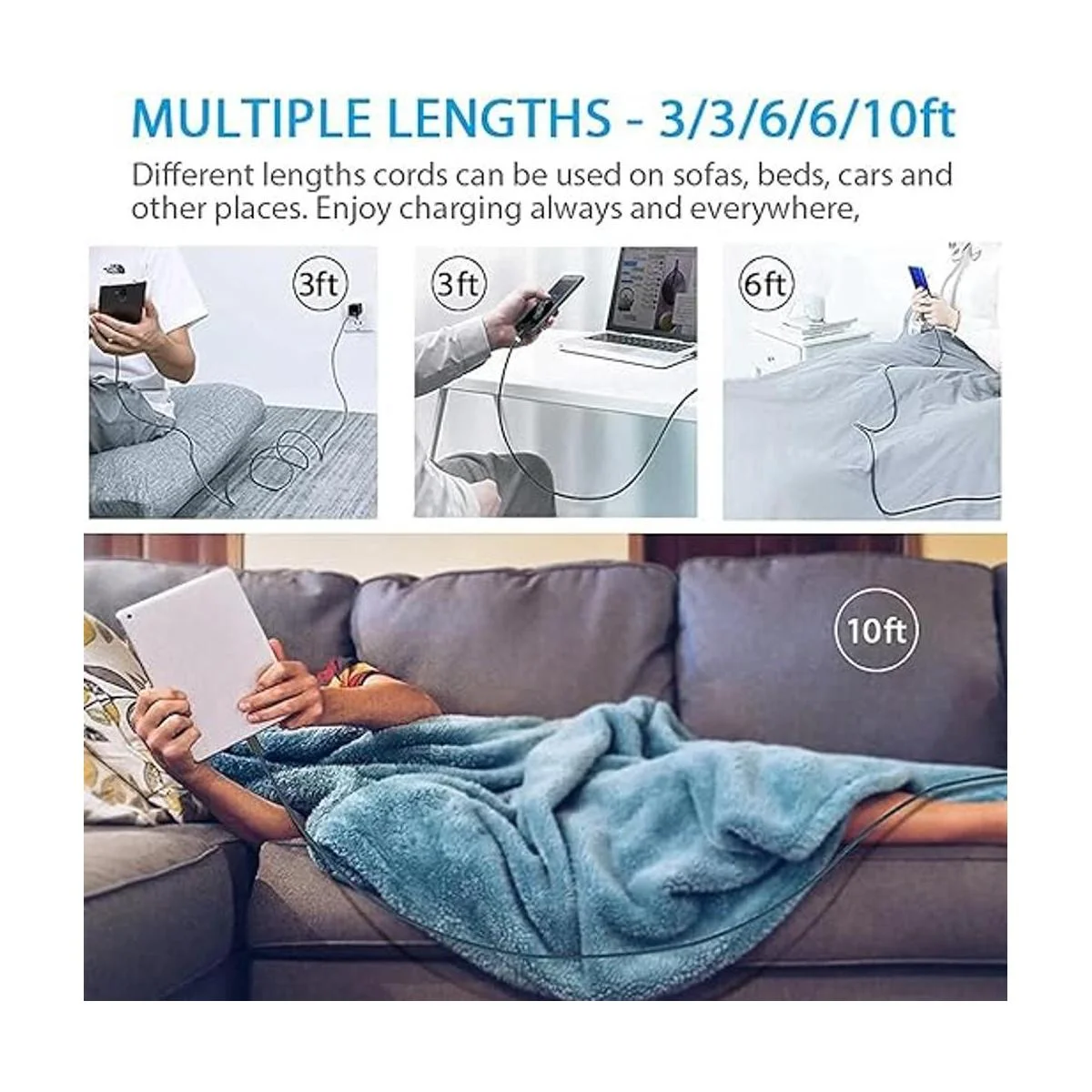 Múltiples longitudes: 3/3/6/6/10 pies. Los cables de diferentes longitudes se pueden utilizar en sofás, camas, coches y otros lugares. Disfruta de la carga siempre y a todas partes, sin preocuparte por llevar el cable a cualquier lugar.