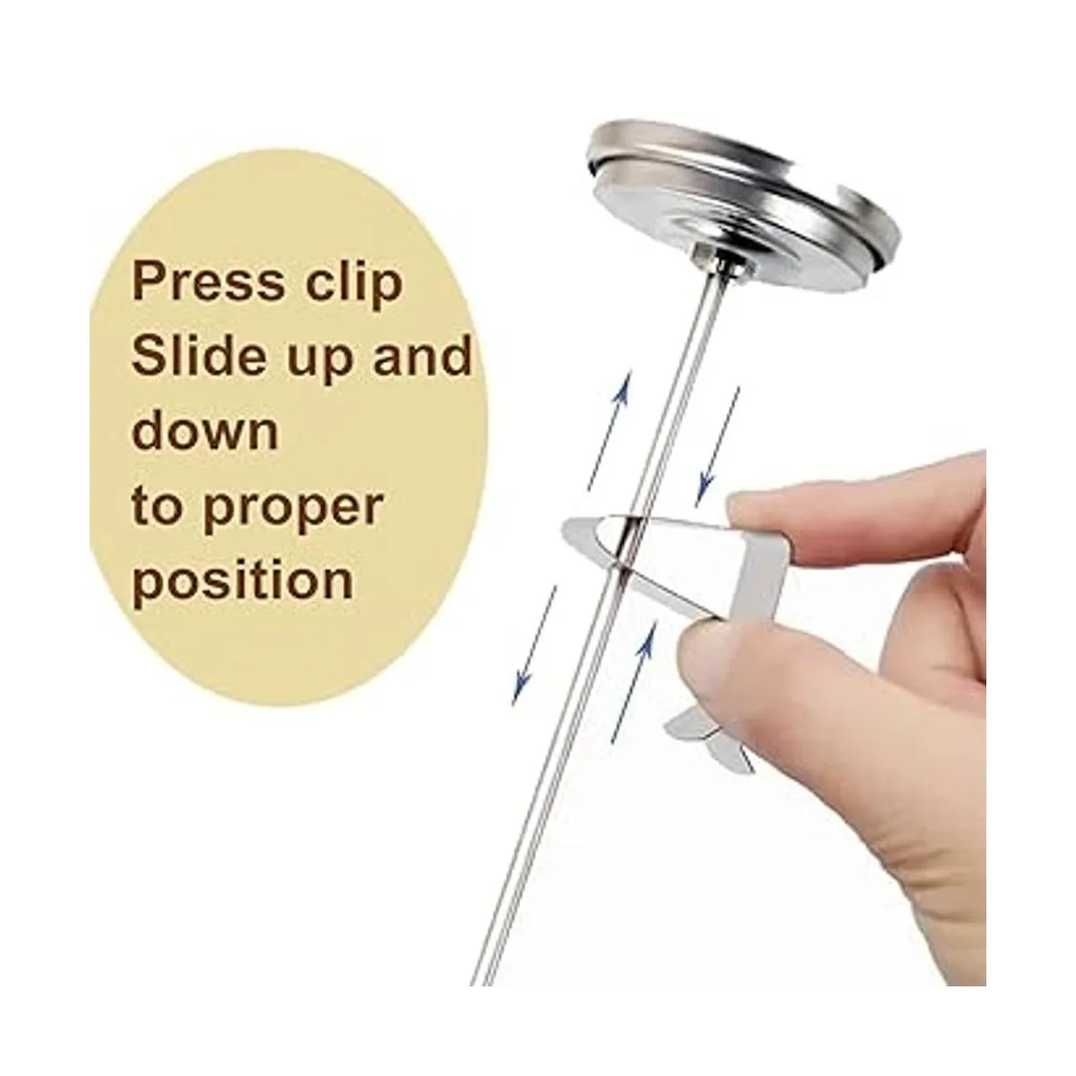 Acero inoxidable de grado alimenticio: el clip deslizante ajustable en el vástago puede sostener el termómetro a las jarras firmemente. Vidrio resistente a la niebla, esfera de acero inoxidable de grado alimenticio y sonda lo mantienen resistente, no tóxico, seguro de usar, resistente a la corrosión y fácil de limpiar.