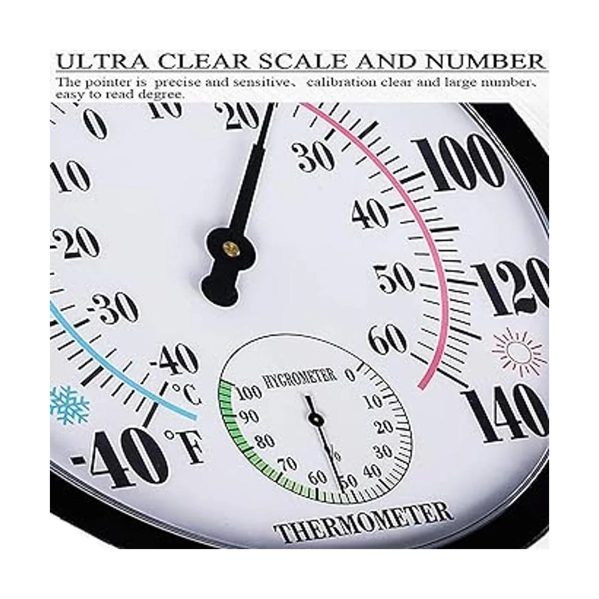 Esfera grande de 10 pulgadas con letras negras en negrita que hace que sea más fácil leer la temperatura y la humedad