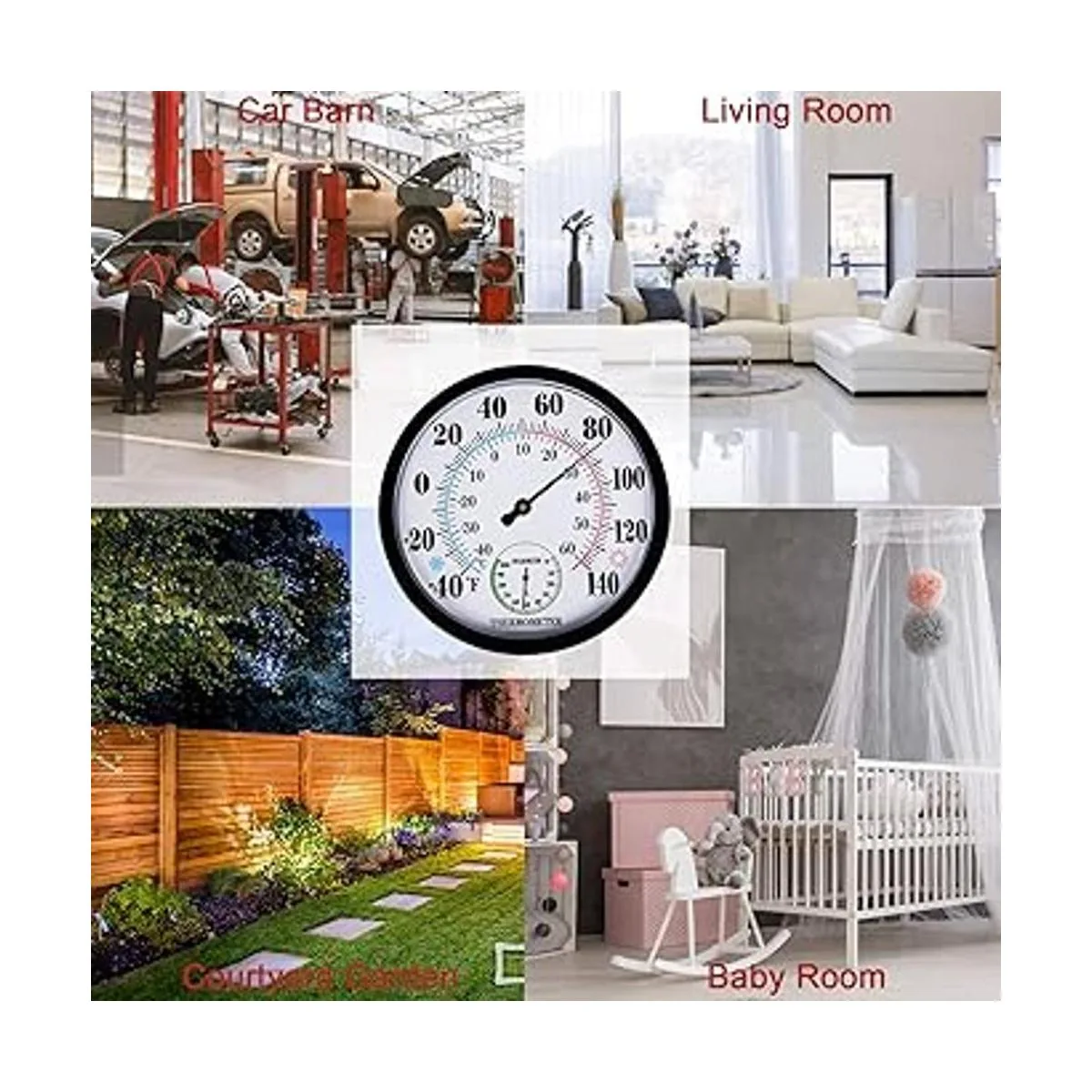 La resistencia a la intemperie y al agua del termómetro se pueden aplicar a la decoración de hogares, oficinas, patios, garajes, etc.