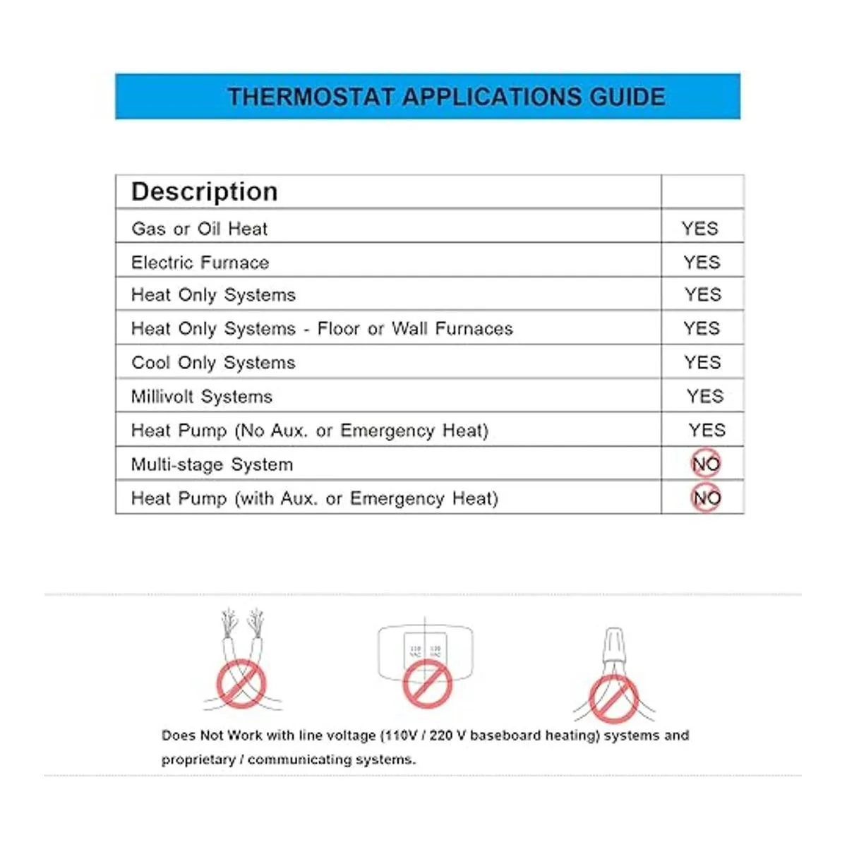 No funciona con bomba de calor auxiliar y sistemas multietapa, no funciona RV, no funciona con zócalo eléctrico de 120/240 V / voltaje de línea.