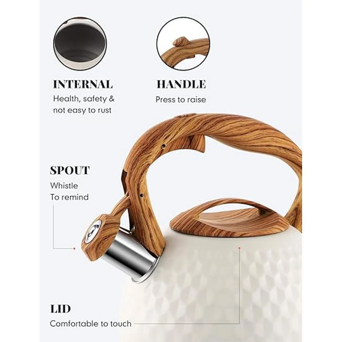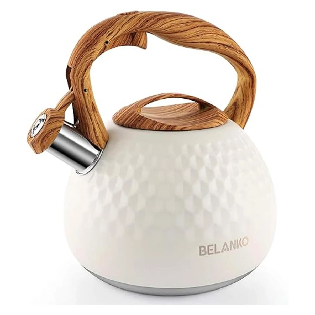 Tetera BELANKO de 2.7 cuartos de galón para estufa, mango de madera con silbato fuerte.