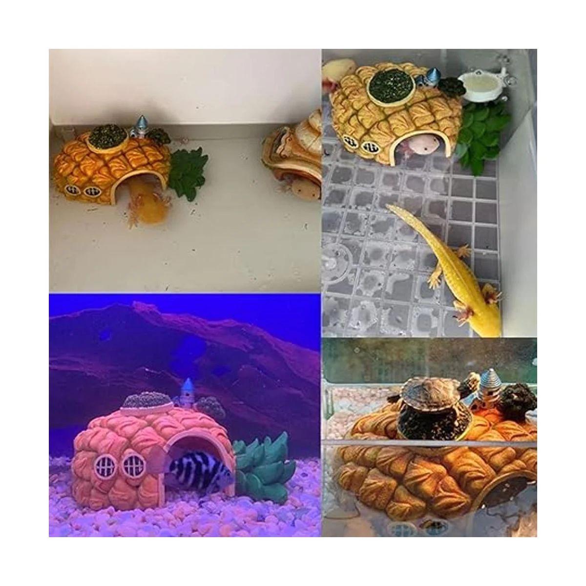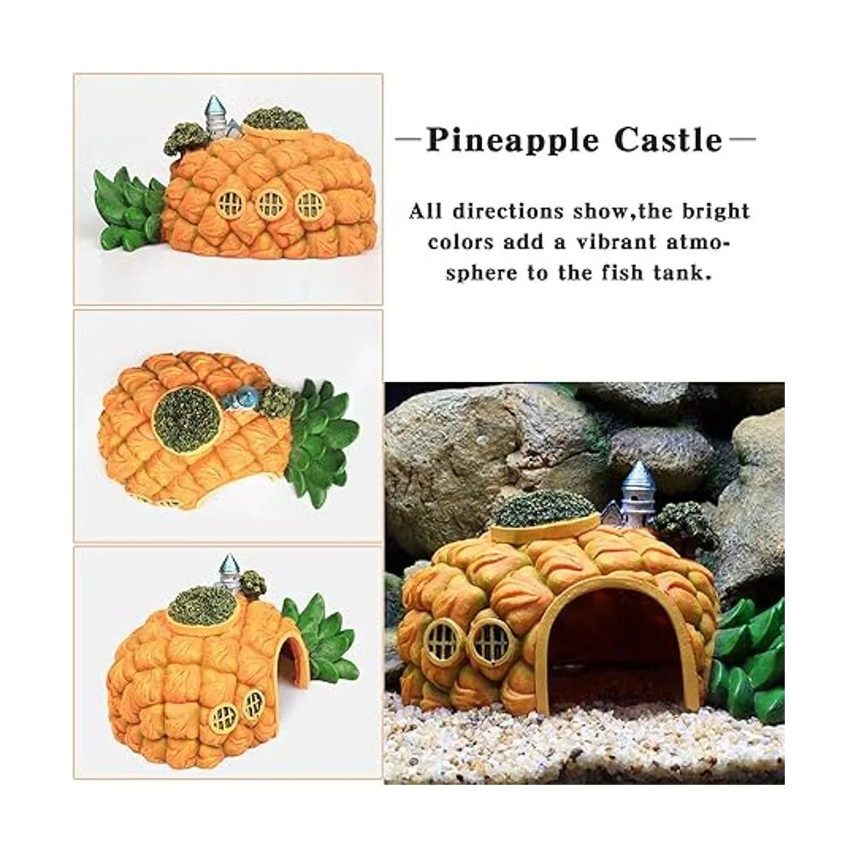 Añade paisaje al acuario: la casa de piña de resina tiene una forma única, colores vivos y realista. Se ve más brillante y colorido bajo el agua, también hace que tu acuario se vea vívido, añade color de dibujos animados al tanque de peces. Tu bonita mascota betta u otros peces estarán muy felices de entrar y salir de la cueva para dormir, descansar, esconderse, jugar y criar, reducir el aburrimiento y crear un ambiente saludable.