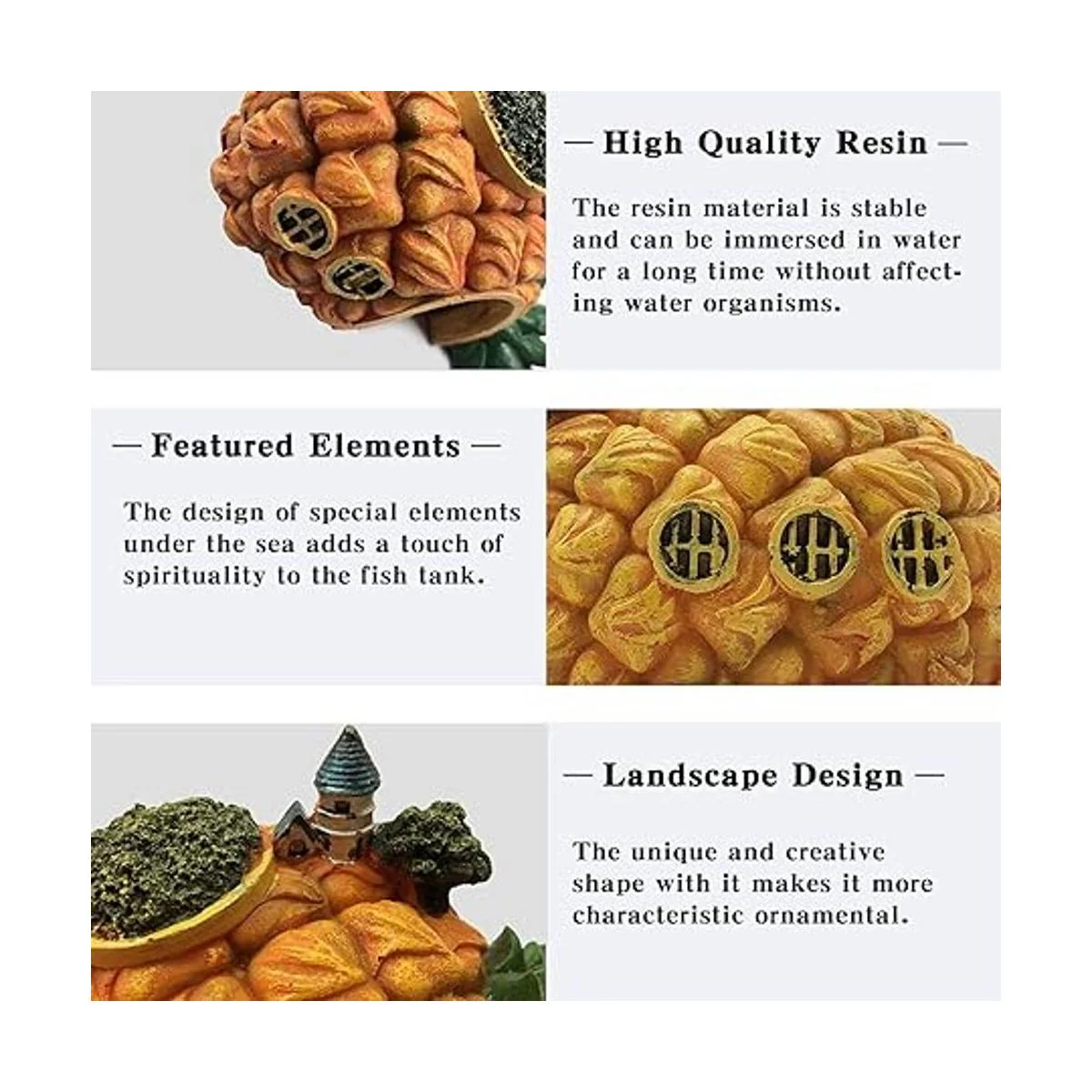 Material de alta calidad: la casa de piña para acuario está hecha de resina de alta calidad y pintura resistente al agua pintada a mano, los detalles pintados a mano no se desvanecen después de ser empapado durante mucho tiempo, seguro y no tóxico, duro y resistente, y no contaminante. No supondrá daño a tus animales acuáticos ni crea ningún mal impacto en la calidad del agua. También no hace daño a pequeños reptiles. Perfecto para acuarios de agua dulce y salada.