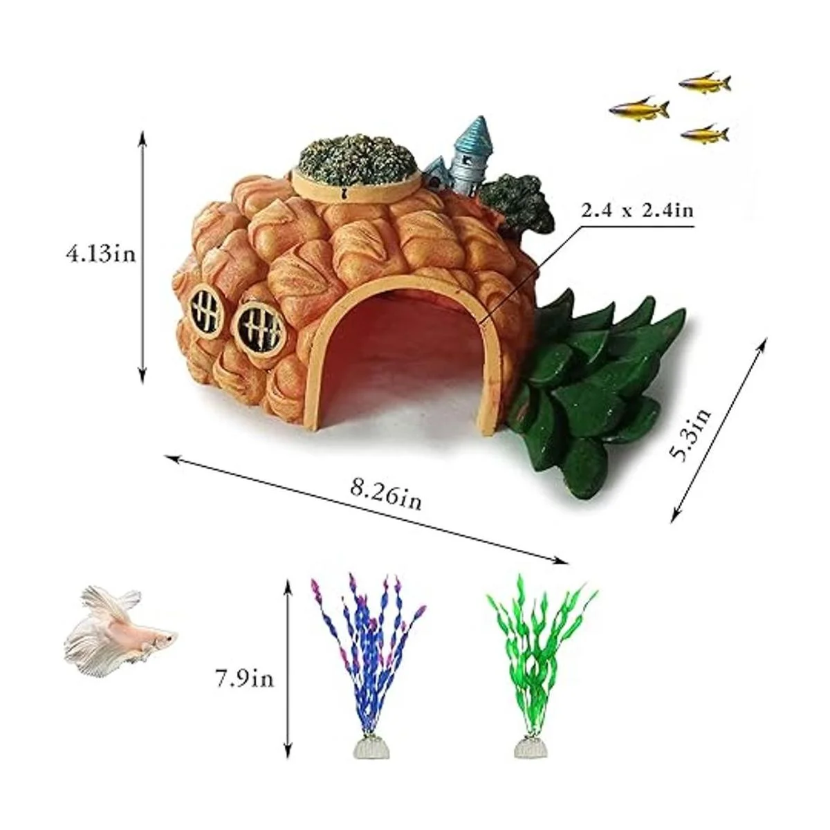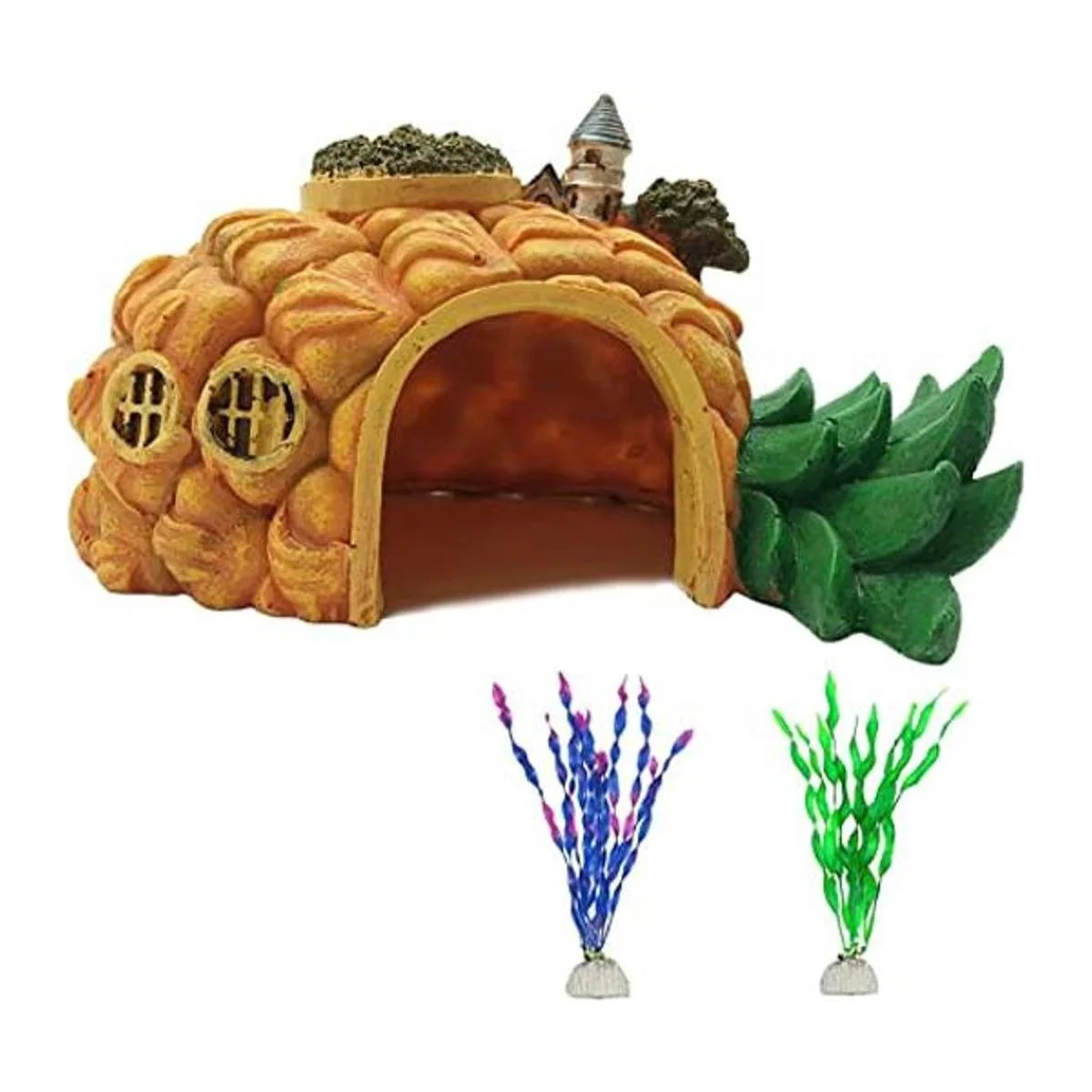 Tfwadmx Acuario con forma de piña decoraciones de resina castillo escondite cueva ornamentos pecera casa refugio decoración plantas de plástico artificial realista paisaje subacuático cabaña para la cría de camarones esconderse