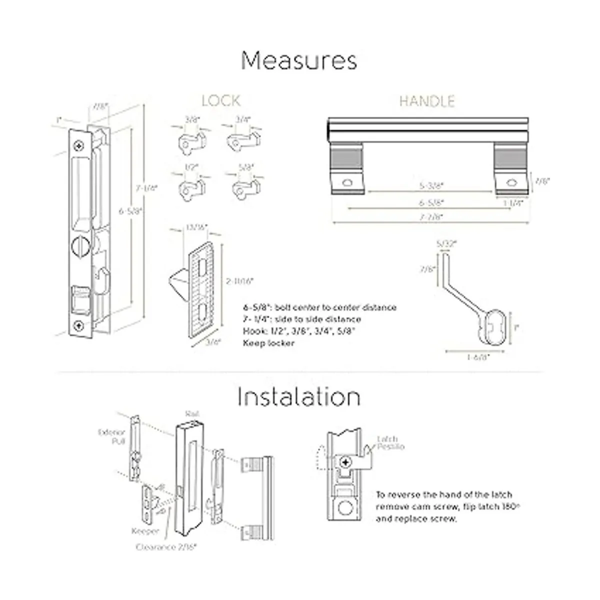 Incluye: la distancia de montaje de la manija de la puerta corrediza de los tornillos es de 65/8 pulgadas, incluye todos los accesorios necesarios para una instalación adecuada.