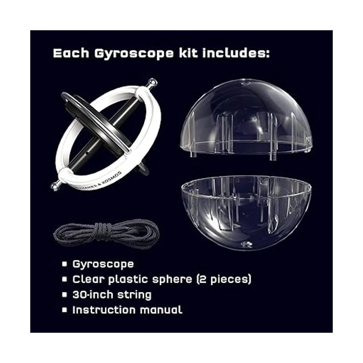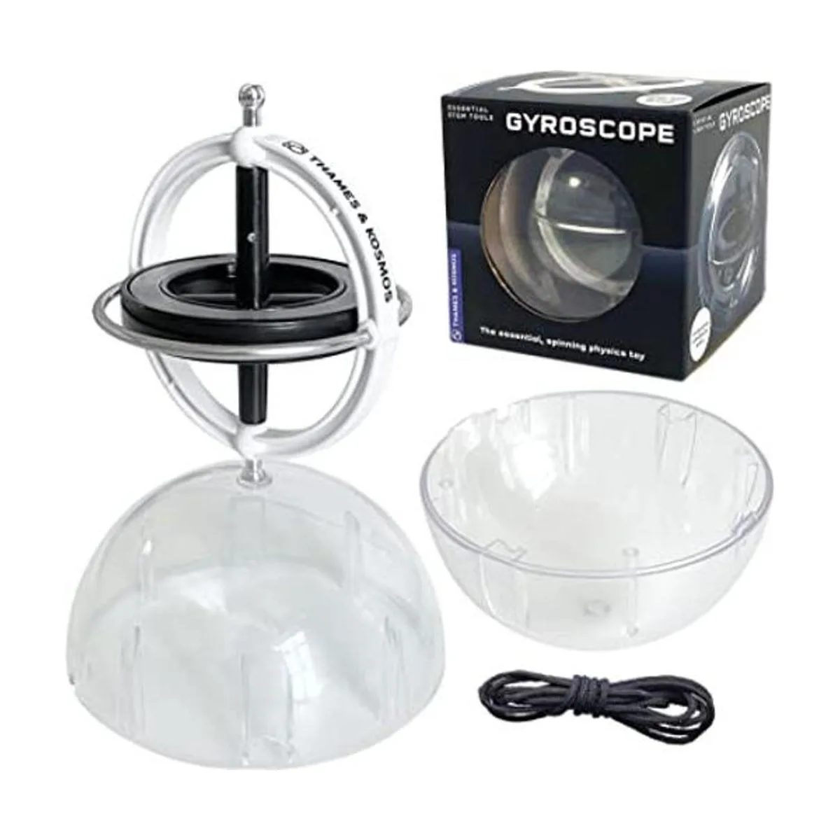 El giroscopio viene con una cuerda de 30 pulgadas, una esfera de plástico transparente que funciona como soporte y estuche de almacenamiento, así como manual de 6 páginas con experimentos para explorar la física del movimiento, las fuerzas y la gravedad.