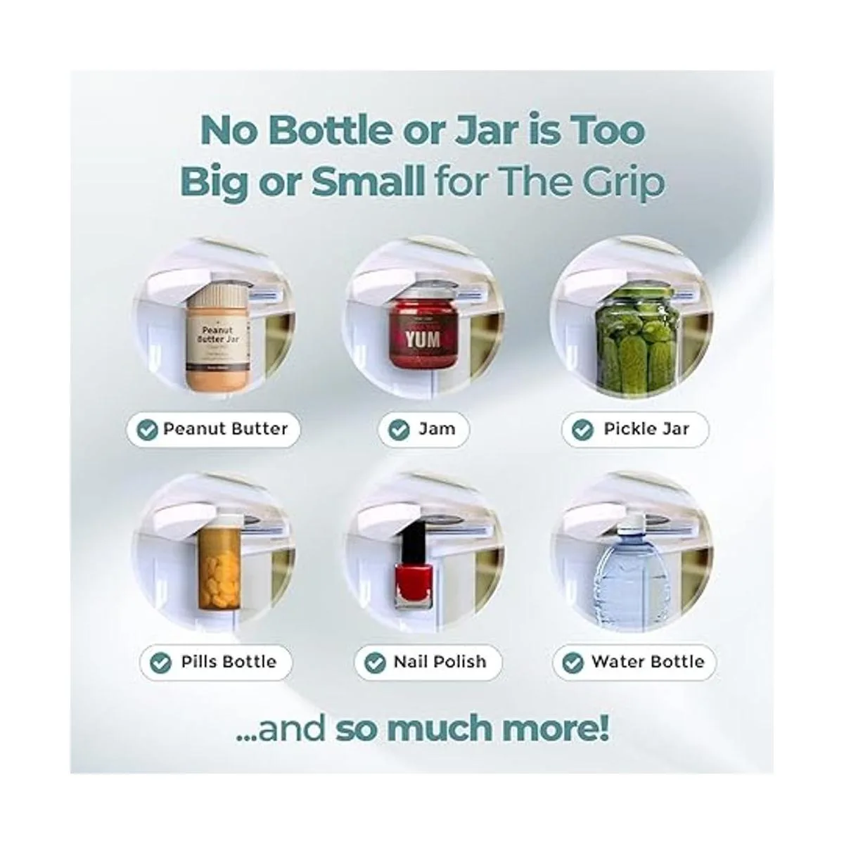 ANY LID SIZE OR TYPE: from fingernail polish to large mason jars, our easy jar opener is MULTIFUNCTIONAL as an opener for jars AND bottles. Literally all of them: tough vacuum sealed jars, water and soda bottles, child proof medicine bottles, nail polish, etc. You name the lid The Grip Jar Opener can open it easily.