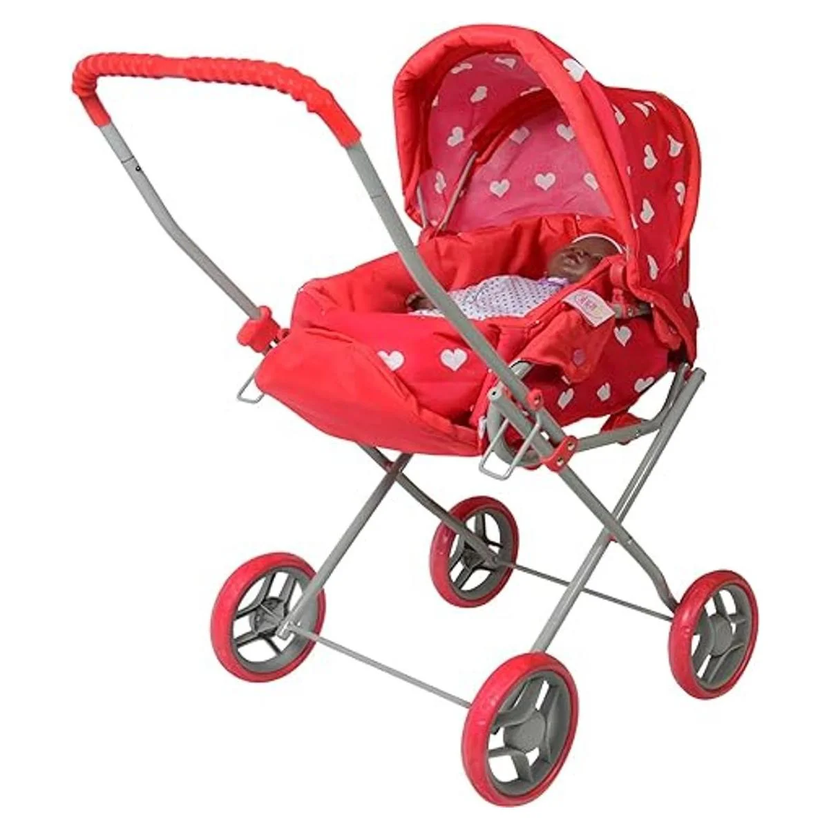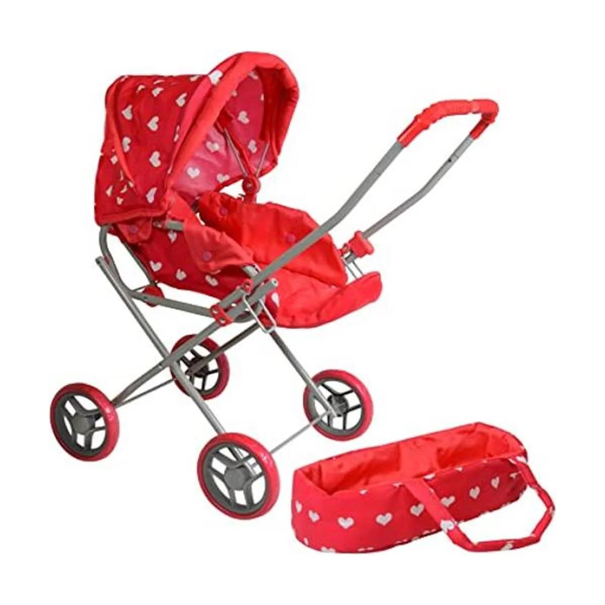 The New York Doll Collection Cochecito de moisés con estampado de corazón y bolsa de transporte para muñecas de 18 pulgadas, A149, rojo