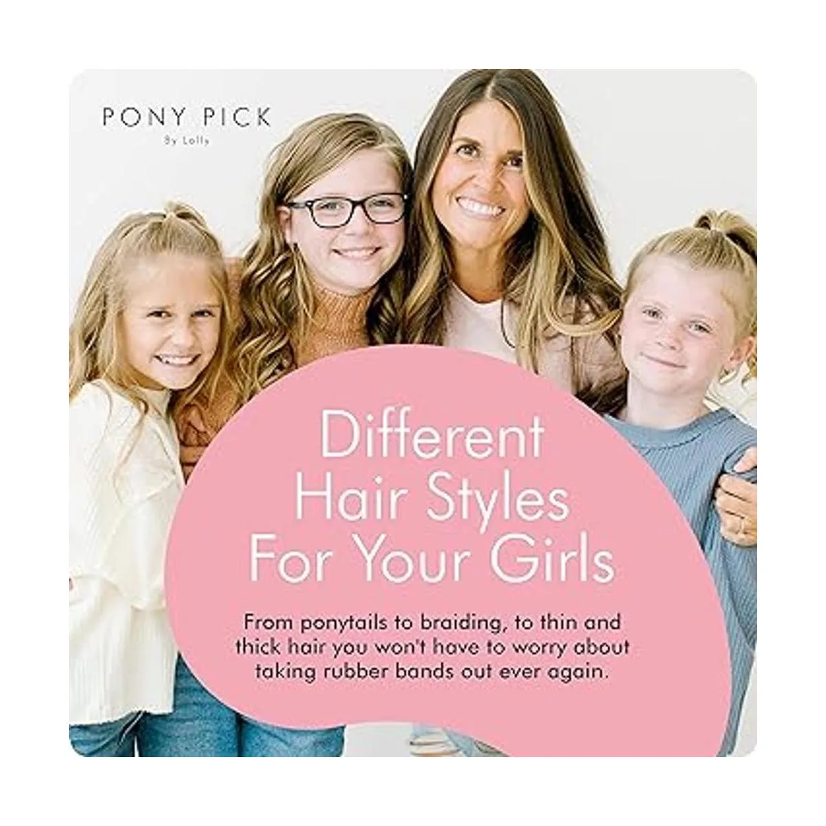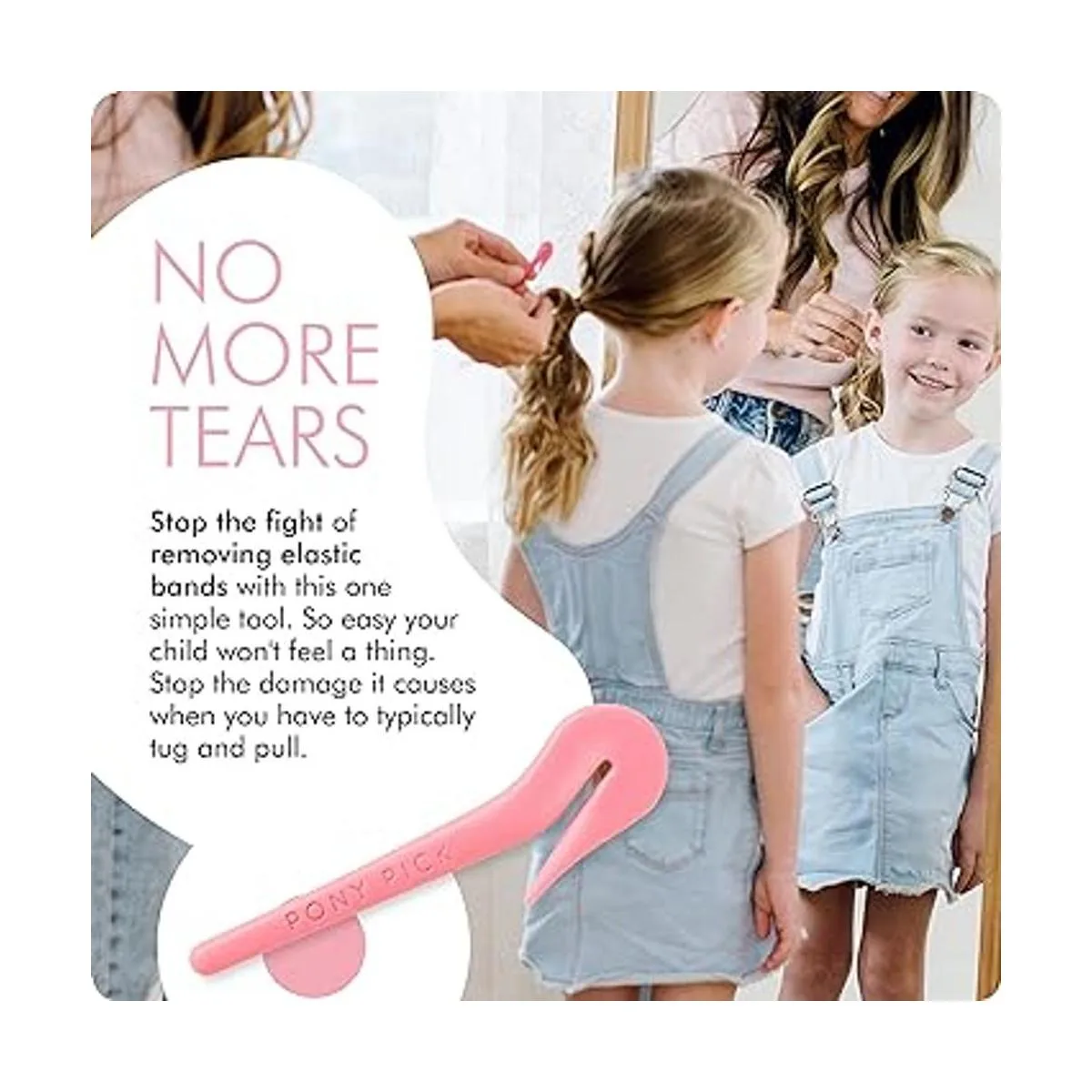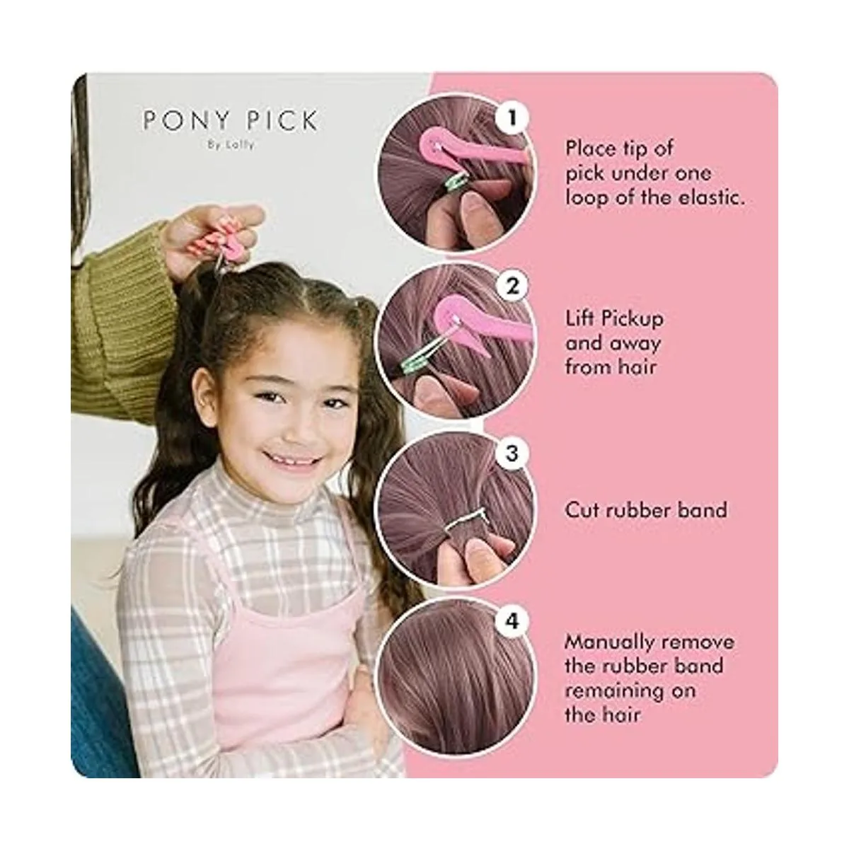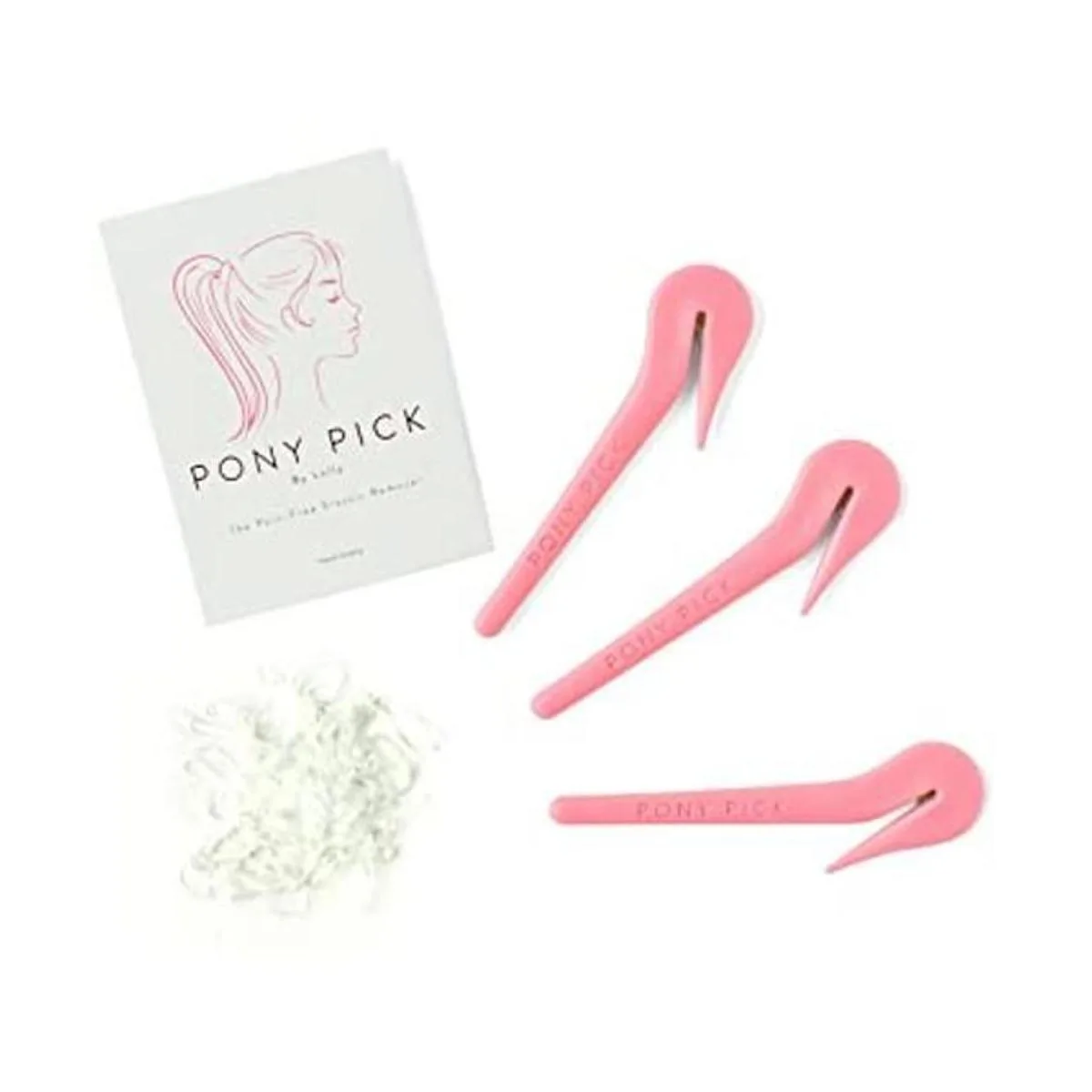 THE PONY PICK By Lolly Cortador de bandas elásticas de goma para el cabello, removedor de bandas elásticas para el cabello, sin dolor, fácil de quitar, paquete de 3 púas de poni rosa y 50 elásticos para el cabello transparente, herramientas y accesorios de fácil agarre