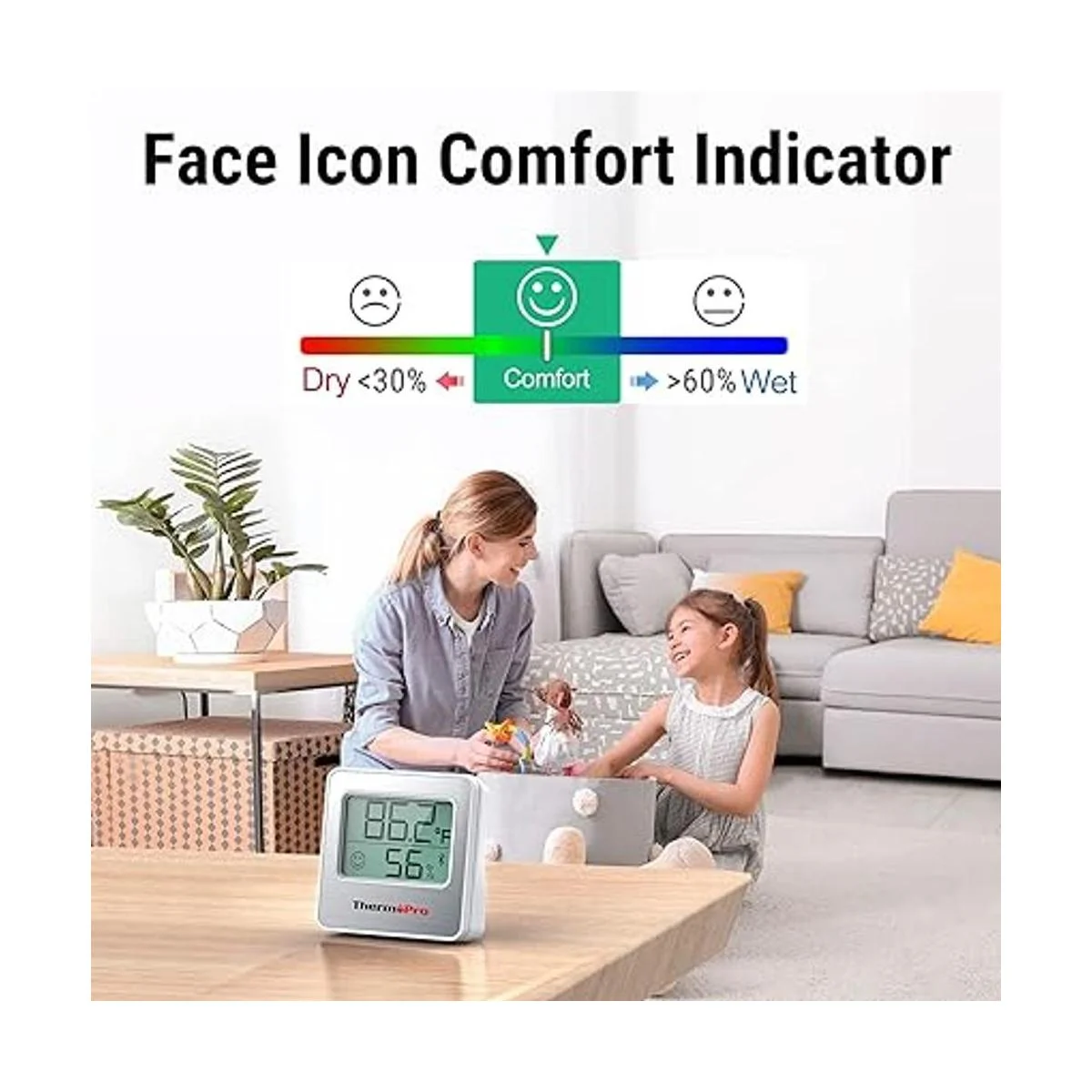 Indicadores faciales cómodos: el termómetro interior para el hogar cuenta con iconos faciales cómodos para indicar condiciones de aire seco/cómodo/húmedo en un formato fácil de entender y te permite ajustar tu humidificador o deshumidificador en consecuencia
