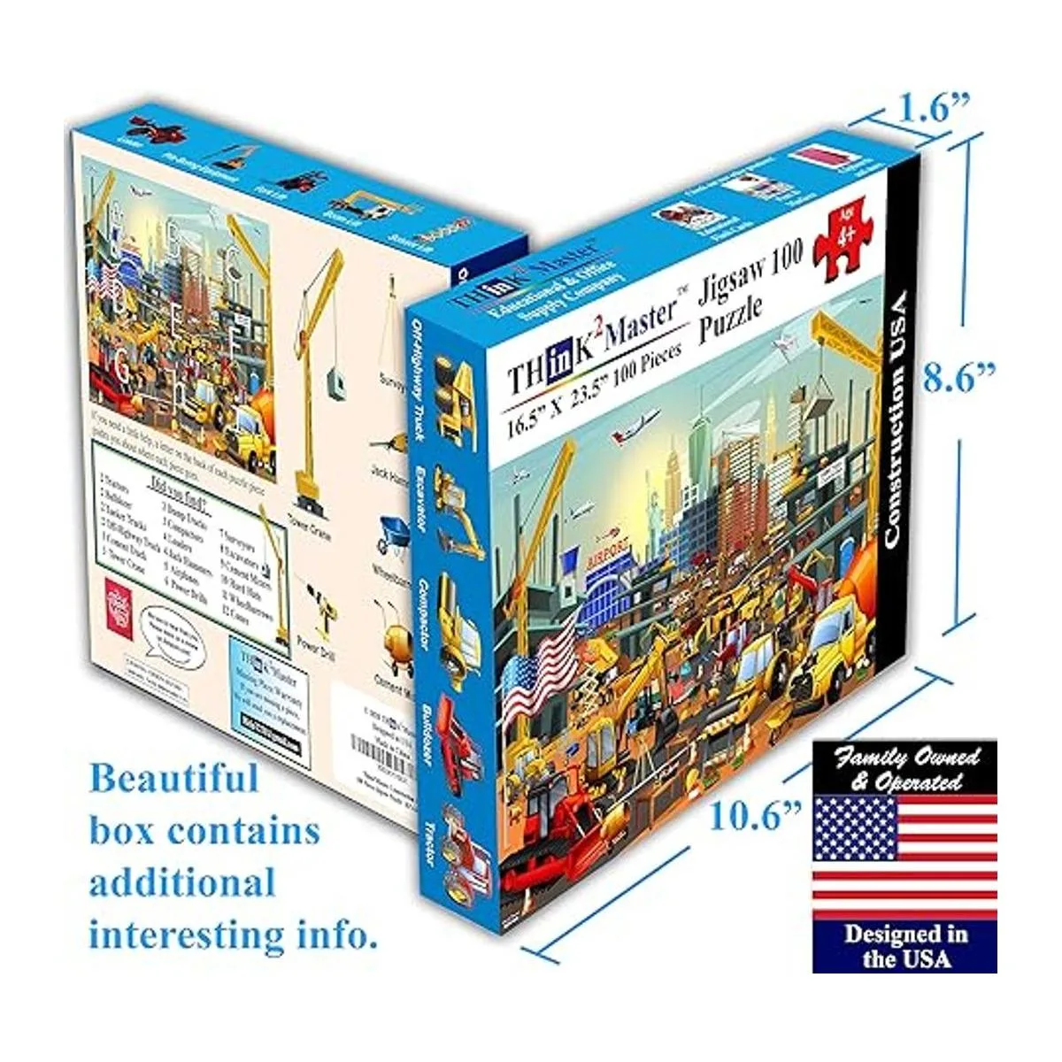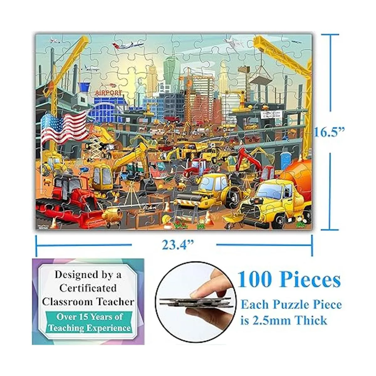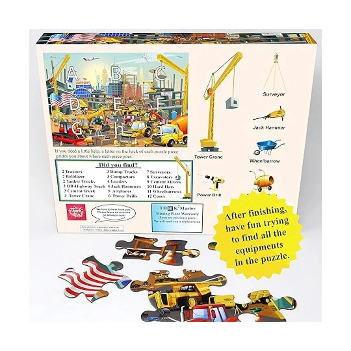Actividad divertida: después de completar el rompecabezas, los niños y las familias pueden buscar y encontrar todos los vehículos, aviones y herramientas que aparecen en el rompecabezas. Algunos de los artículos están ocultos, por lo que hace que sea extra divertido encontrar todos los artículos ocultos en el lugar de trabajo. La caja también muestra el número de artículos ocultos para encontrar. Aquellos que necesitan un poco de ayuda pueden mirar la parte posterior del rompecabezas para obtener consejos para encontrar las piezas adecuadas.