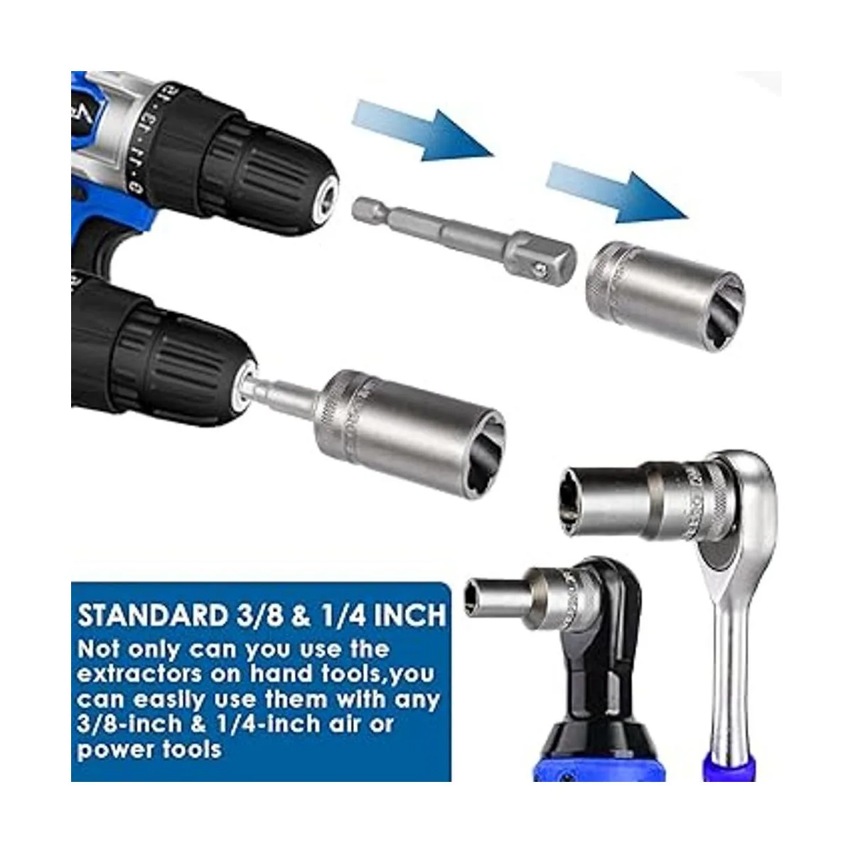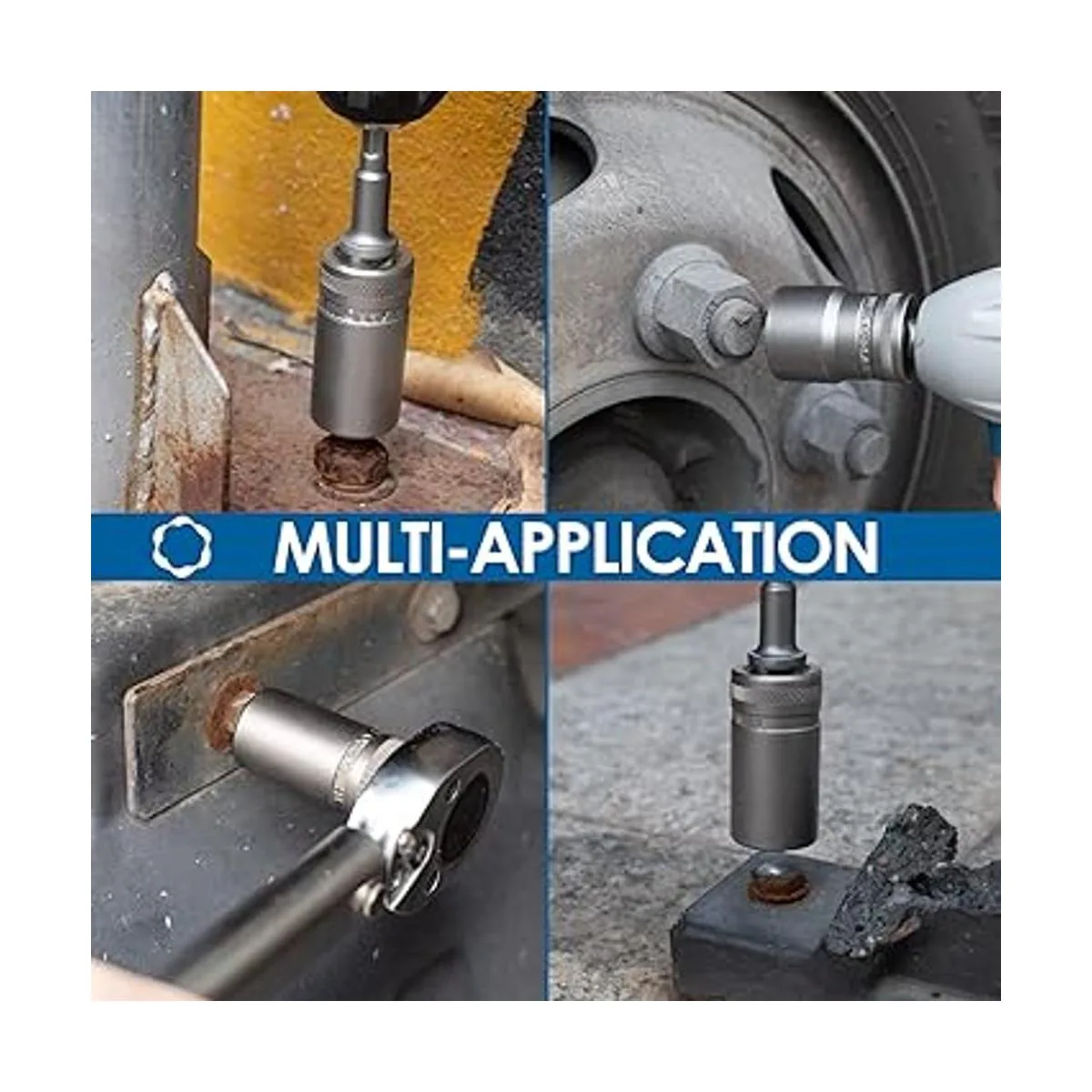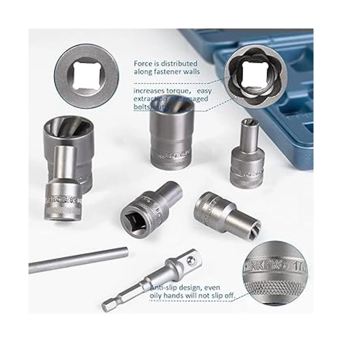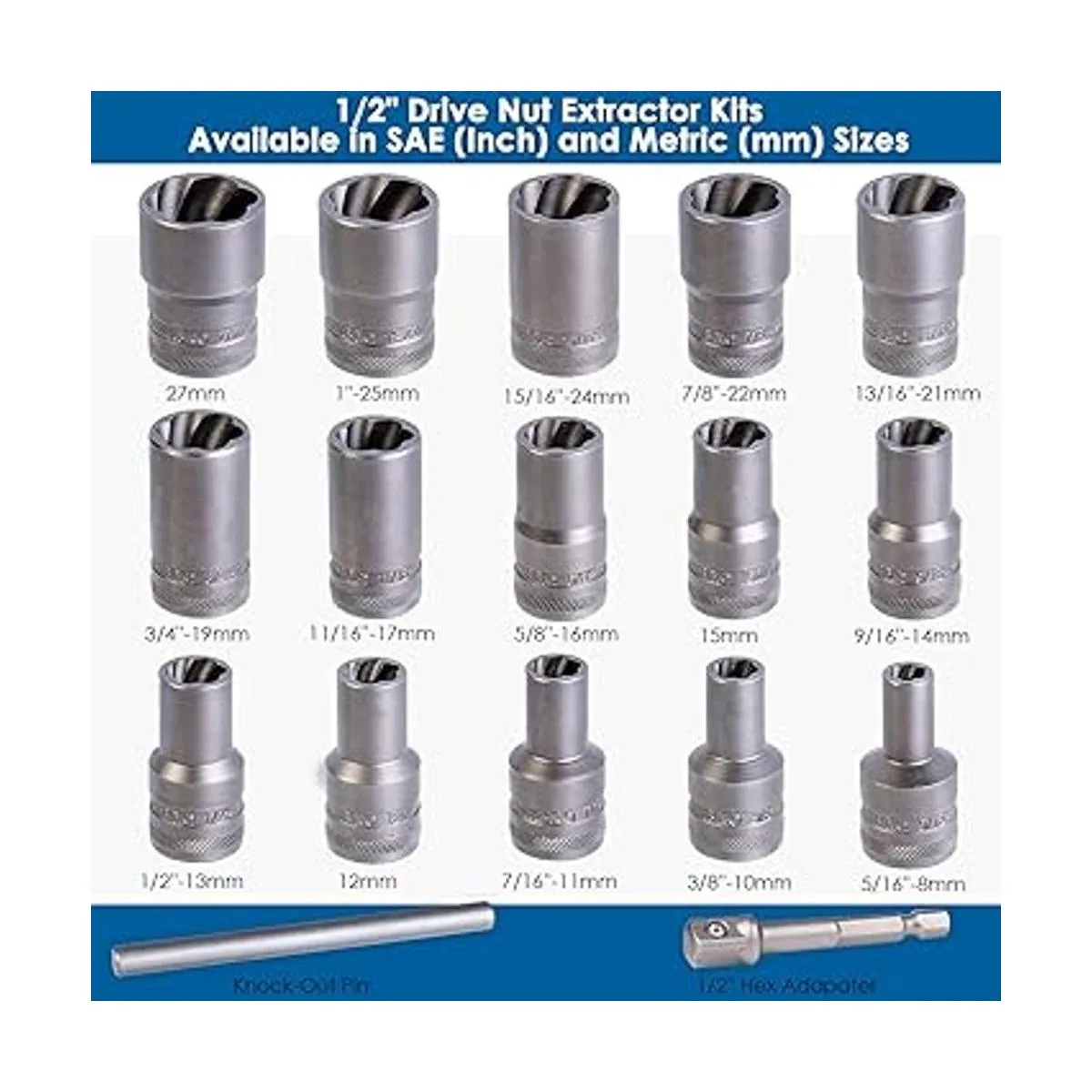 Herramienta multiusos: este juego de tuercas puede quitar fácilmente pernos de pelado, tuercas dañadas, tornillos redondos y tuercas congeladas. Satisface todas tus necesidades de reparación de automóviles, decoración del hogar o producción de manualidades rápida y fácilmente. El extremo de accionamiento es hexagonal y se puede utilizar con una llave plana, alicates, llave ajustable, enchufe o alicates de bloqueo de tornillo de banco. Adaptador hexagonal universal de 0.5 in para aire, herramientas eléctricas. También viene con una caja de almacenamiento para un fácil acceso y portabilidad.