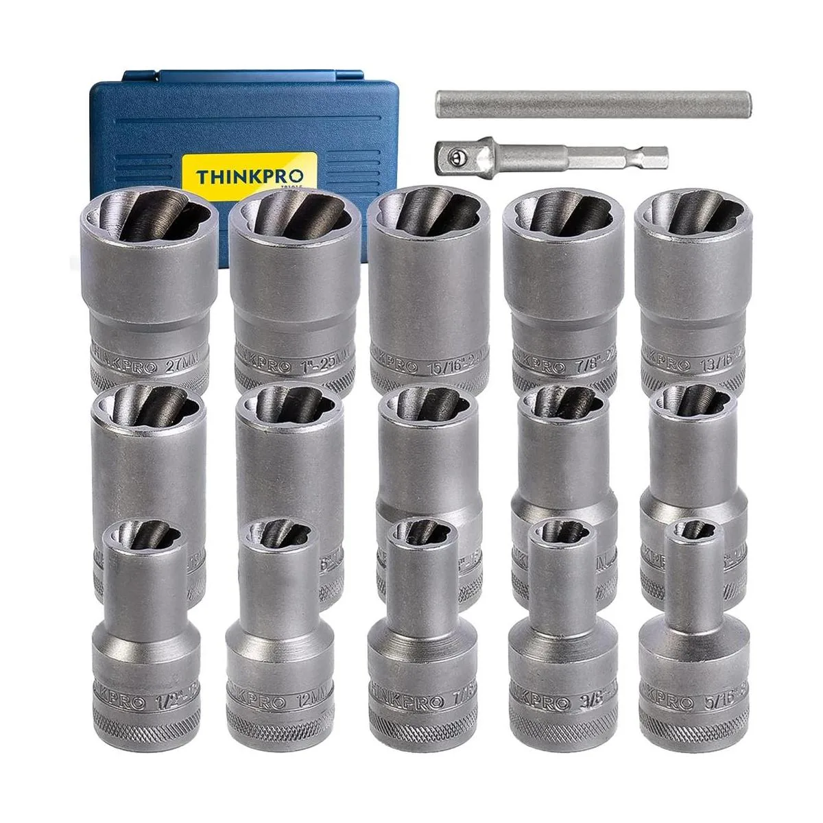 THINKPRO Juego de extractor de pernos mejorado, juego de 17 piezas de pernos de impacto y tuercas, removedor de tuercas de lengeta a rayas, juego de enchufes de extracción para eliminar pernos dañados, congelados, oxidados, redondeados, tuercas y tornillos