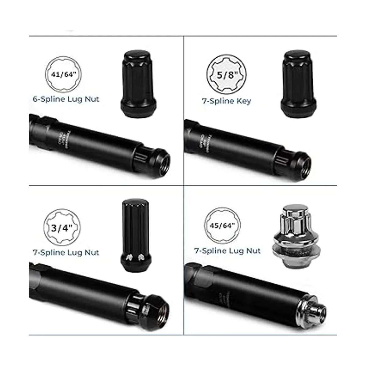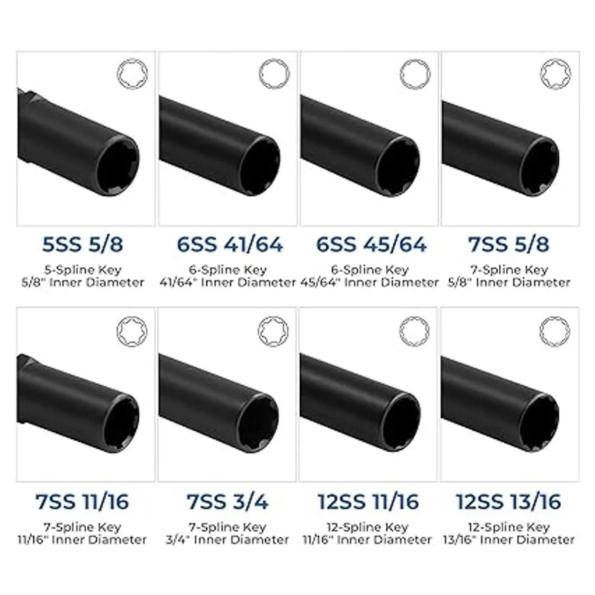 Kit de extracción de bloqueo de rueda de 8 piezas: 8 tamaños de diámetro interior de ranura 12 ranuras de 13/16 pulgadas, 12 ranuras de 11/16 pulgadas, 7 ranuras de 3/4 pulgadas, 7 ranuras de 5/8 pulgadas, 7 ranuras de 11/16 pulgadas, 6 ranuras de 41/64 pulgadas, 5 ranuras de 5/8 pulgadas. La información de tamaño está grabada permanentemente en cada pieza para una identificación rápida.