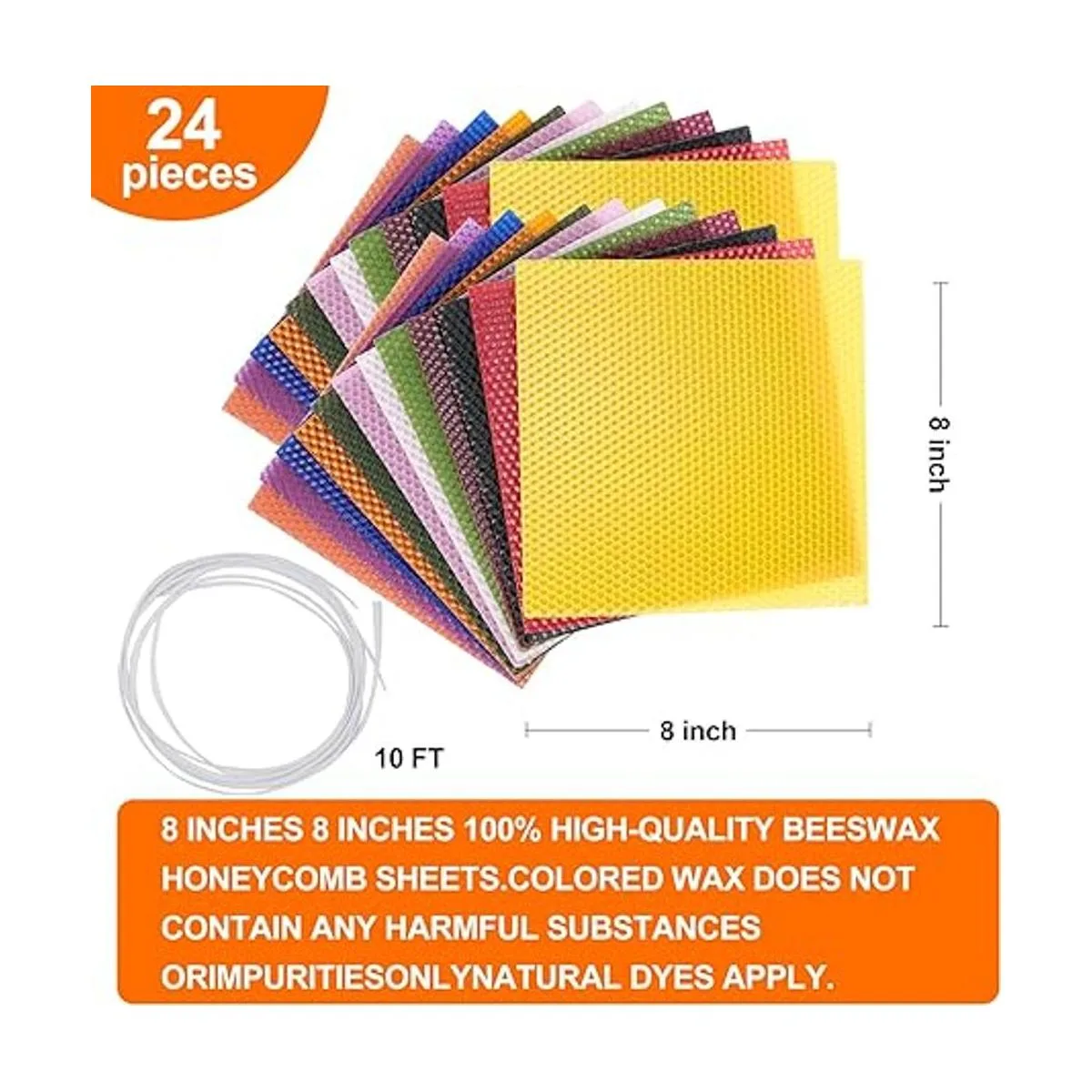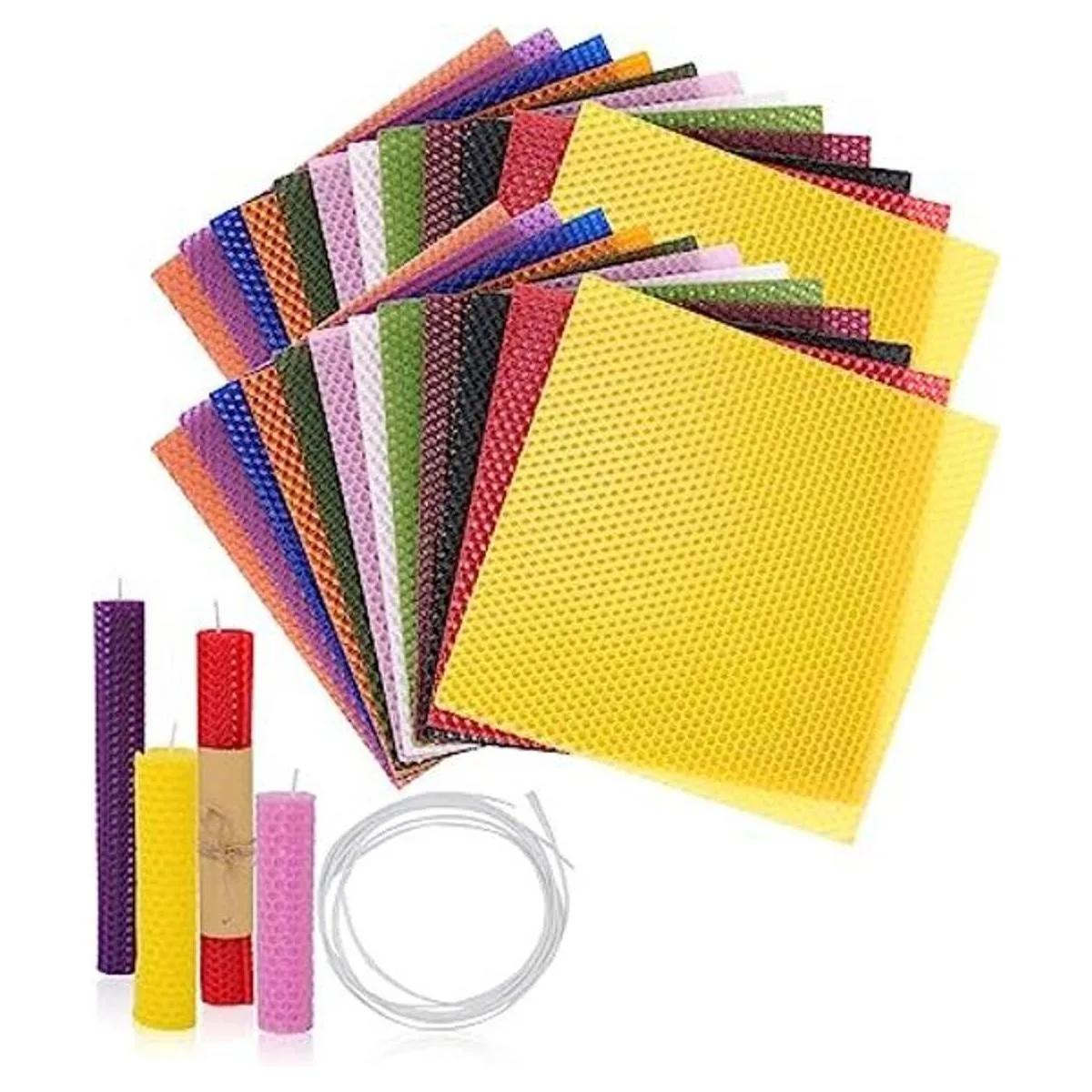 El kit para hacer velas de cera de abeja incluye: Nuestro kit para hacer velas de cera de abeja incluye 24 hojas de cera de abeja en 12 colores diferentes, el tamaño es de 8 x 8 pulgadas y con una mecha de algodón 10 pies. Puedes crear tus propias velas de cera de abeja o un interesante proyecto de manualidades para niños.