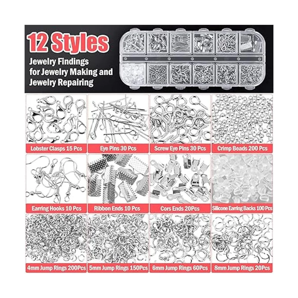 Suministros de búsqueda de joyas: con inclusión de 12 tipos diferentes de accesorios de joyería de anillos abiertos 0.157 in, 0.197 in, 0.236 in, 0.315 in, cierres de langosta, pasadores de ojo, cuentas de crimpado, ganchos de aretes, extremos de cinta, extremos de cordón y parte trasera de goma para aretes, cada tipo de hallazgo se empaqueta por separado en una caja