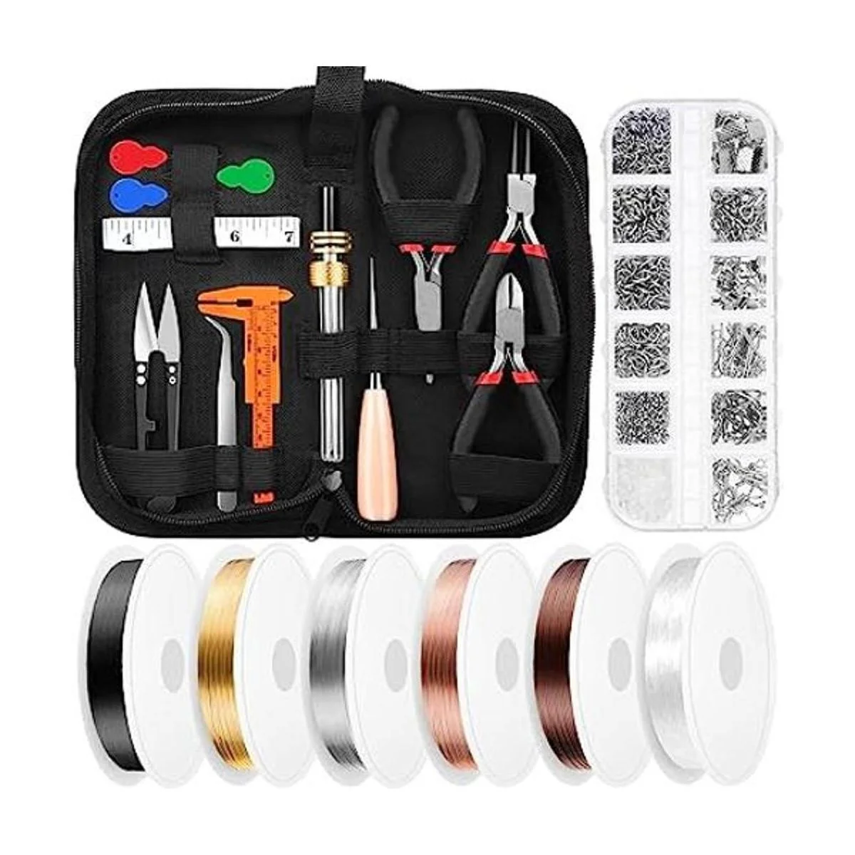 Kit de suministros para hacer joyas: el kit de suministros de herramientas para hacer joyas Thrilez viene con 3 alicates de joyería, 1 cordón de cuerda transparente, 6 agujas, 1 pinza de joyería, 1 pinza, 1 punzón, 1 abridor de anillos de salto, 1 anillo de dedal, 1 tijeras de hilo, 1 cinta métrica, 3 enhebradores de aguja, 1 bolsa con cremallera, 1 caja de diferentes accesorios de joyería y 5 rollos de alambre de joyería de oro, plata, cobre, café y negro
