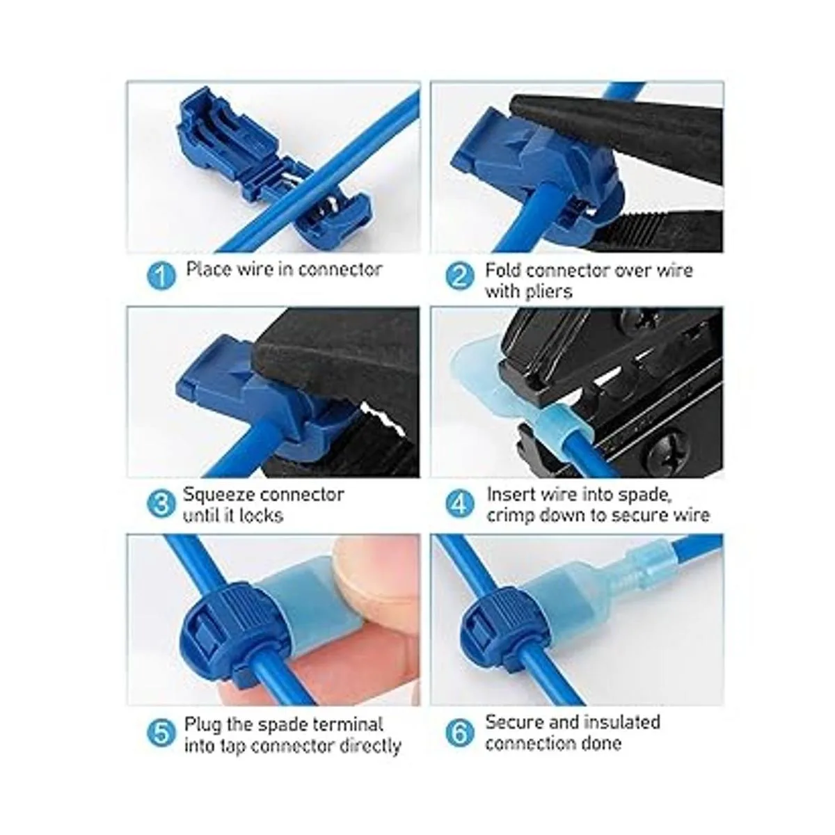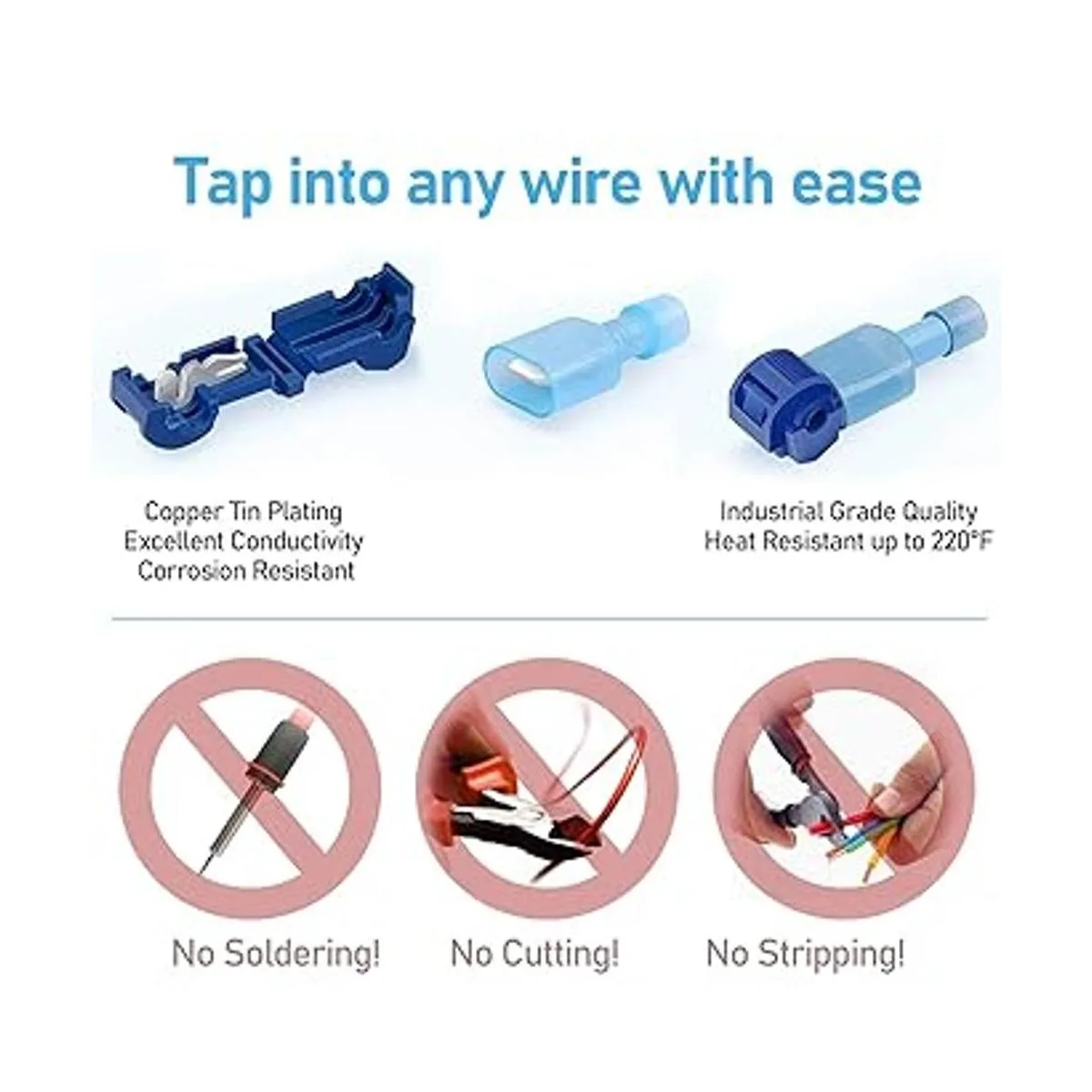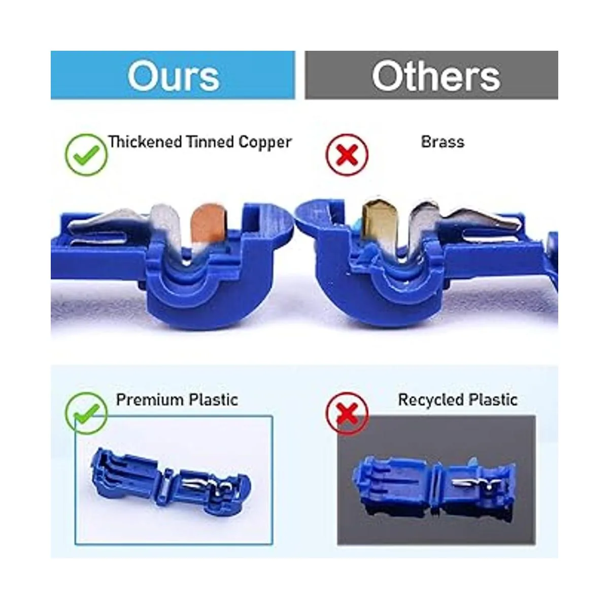 Calidad prémium: los contactos de cobre estañado más gruesos no se doblan incluso cuando se golpean en cables más gruesos; los conectores de empalme rápido en T se bloquean de forma segura en el cable. La carcasa de plástico no se abre después de que se haya enganchado en el cable