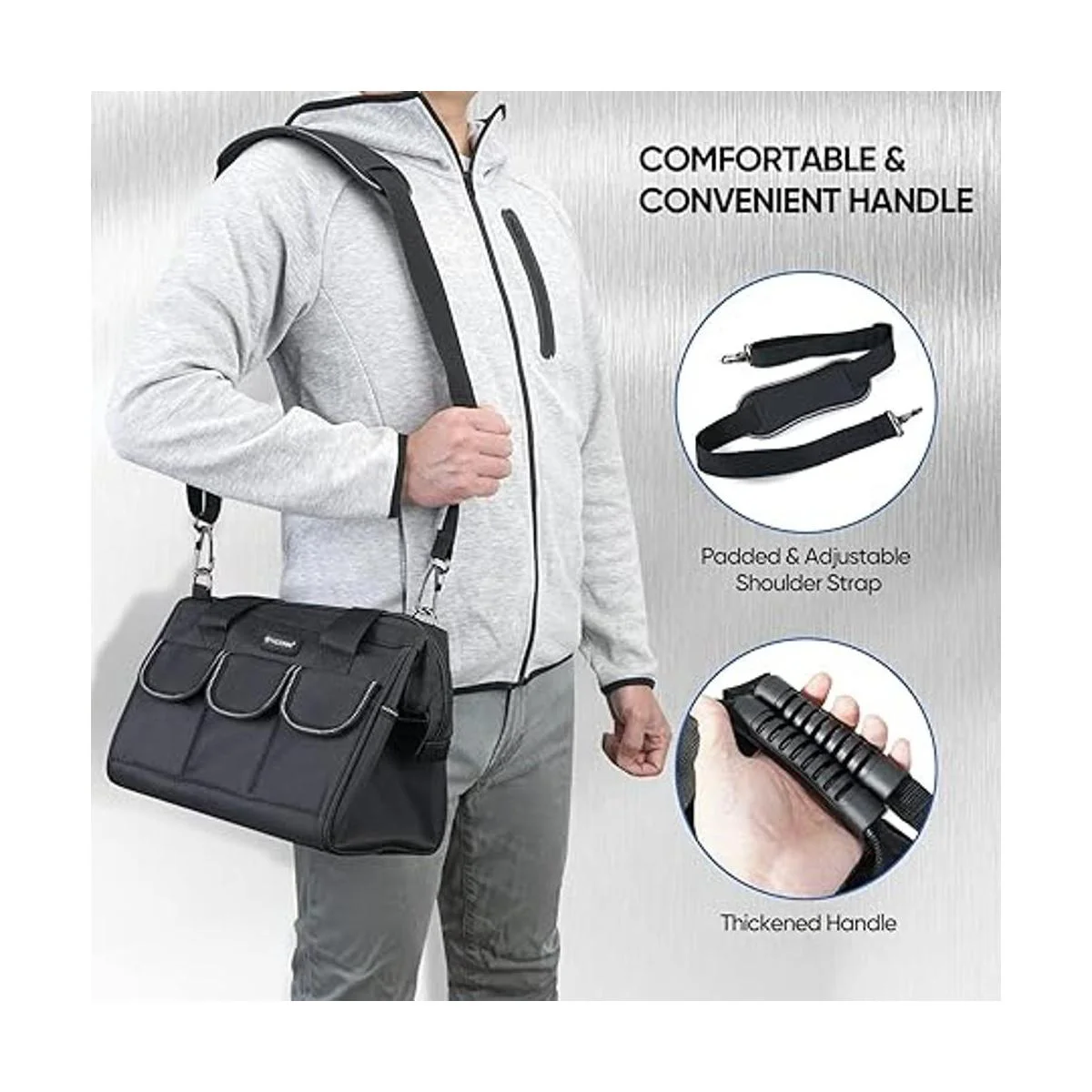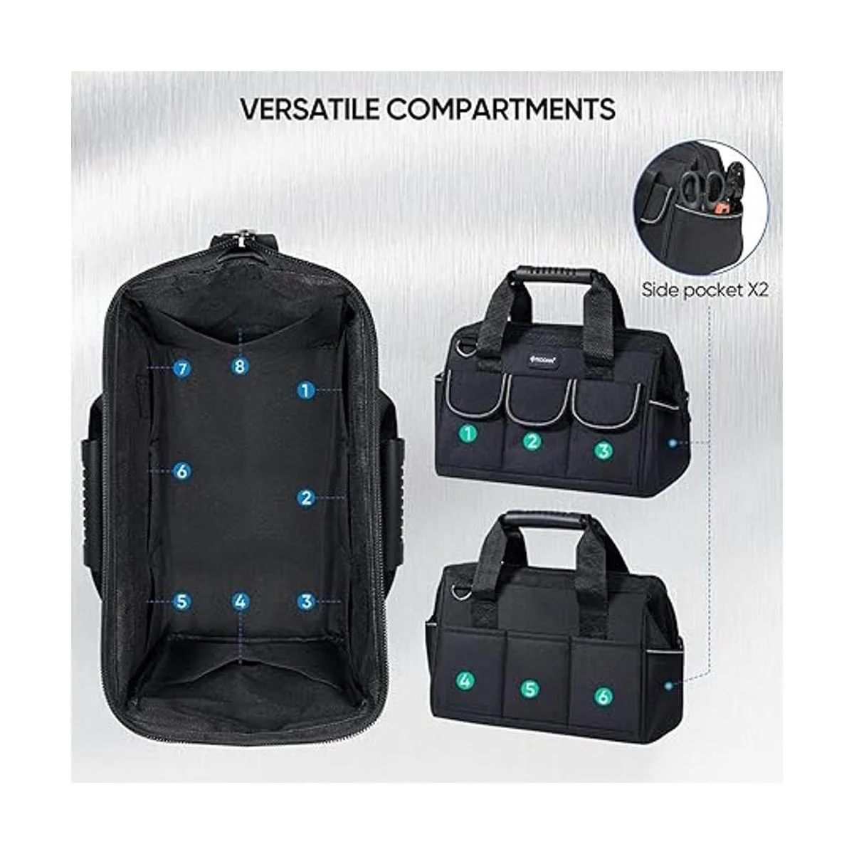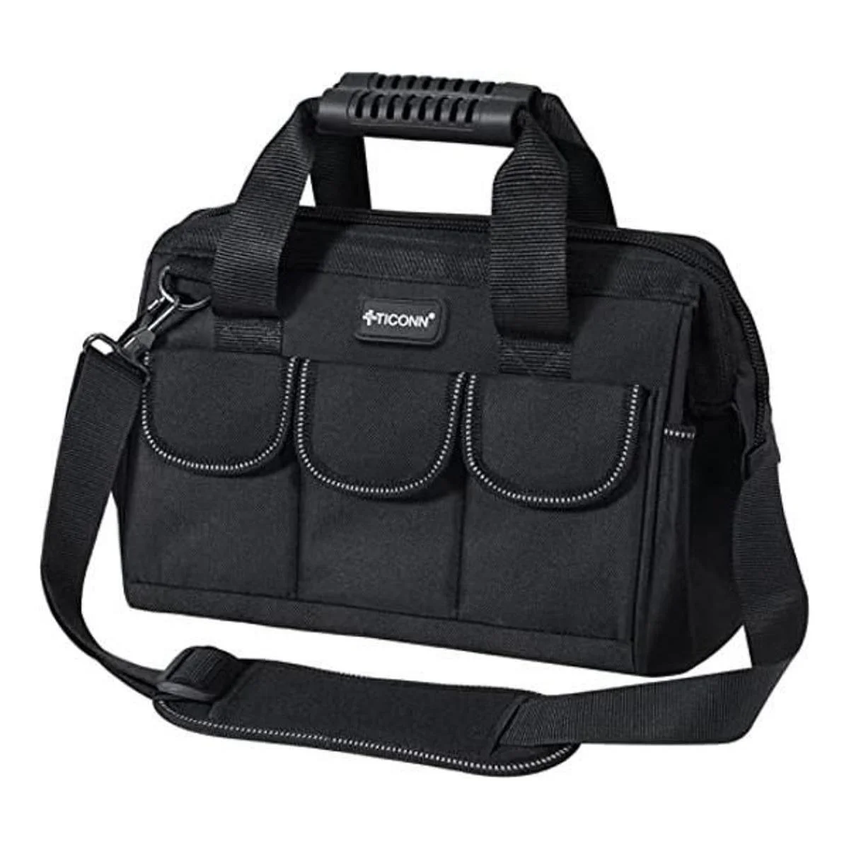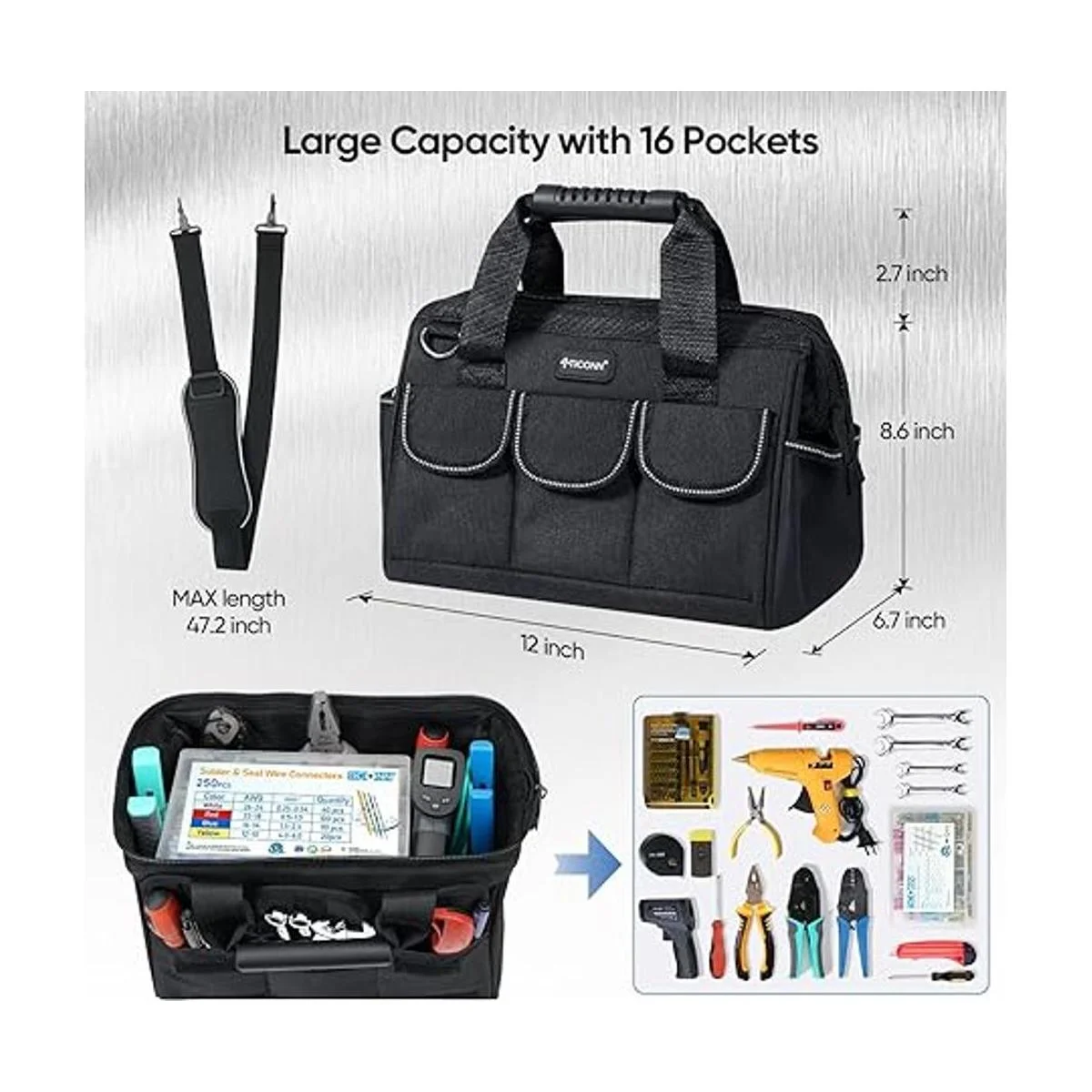 TICONN Bolsa de herramientas de 12 pulgadas con parte inferior suave impermeable, bolsa de herramientas de boca ancha con correas reflectantes de seguridad, correa de hombro ajustable