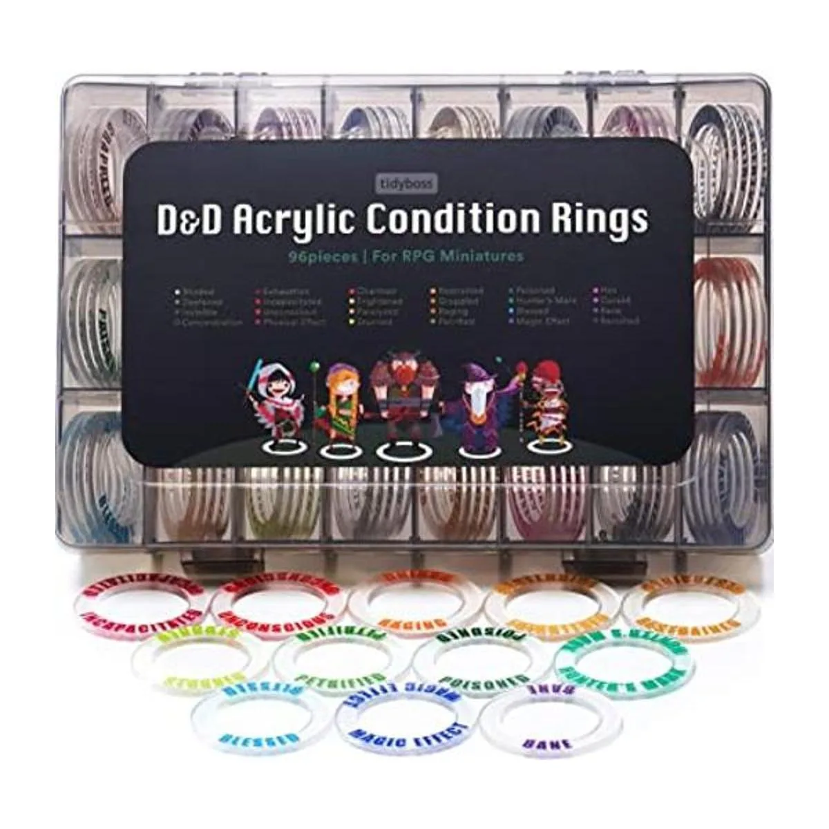 Tidyboss DND Anillos acrílicos de condición en miniatura, 96 marcadores de efectos de estado en 24 condiciones y colores para mazmorras y dragones, accesorios de juego para juegos de mesa de juegos de rol con caja de almacenamiento