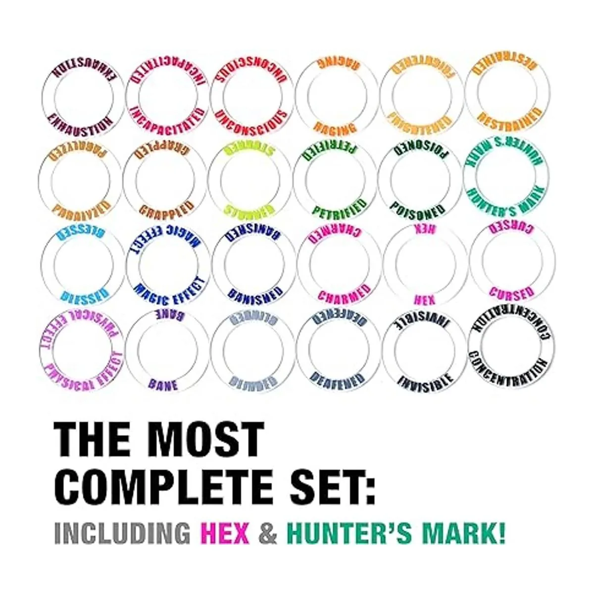 Fácil de leer: los anillos TidyBoss están coloreados para una fácil identificación. También tenemos Hex y Hunters Mark, a menudo faltan efectos de hechizo de otros juegos. Incluye: cegado, sordo, invisible, agotamiento, incapacitado, inconsciente, efecto físico, encantado, concentración, asustado, paralizado, aturdido, restringido, grappled, raging, petrificado, venenado, marca de cazador, bendecido, efecto mágico, hexagonal, maldito, bane, desterrado.