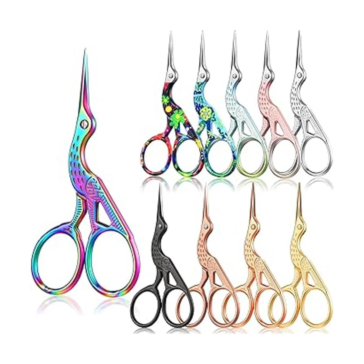 Cantidad y colores suficientes: hay 10 pares de tijeras en forma de grúa en 10 colores diferentes, es decir, plata, oro, gris, negro, oro rosa, arco iris, etc. Cantidad adecuada y colores ricos para tus opciones