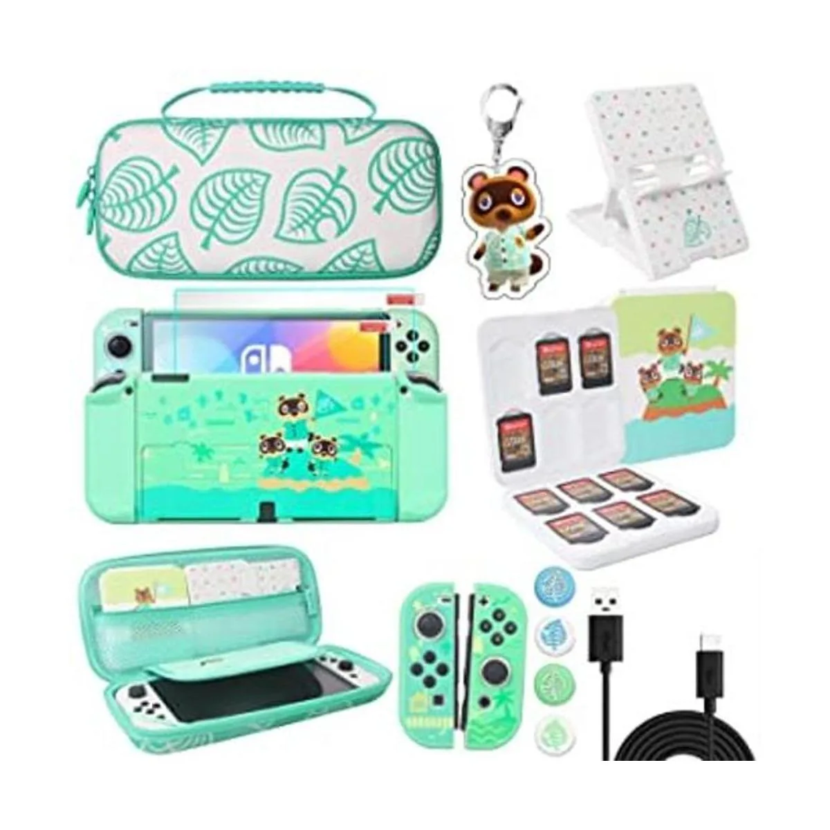 8 en 1 El paquete incluye: 1 funda de transporte, 1 funda protectora dura, 1 soporte, 1 cable de carga, 2 protectores de pantalla, 1 funda para tarjetas de juego, 4 tapas de agarre para pulgar de hoja y 1 llavero de regalo.