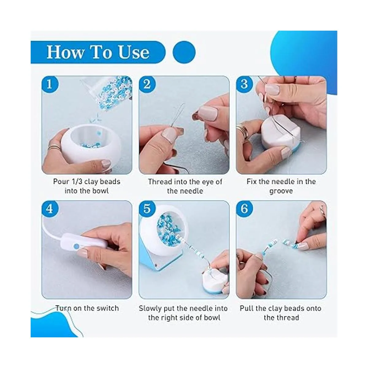 Modo de empleo: 1. Vierte 1/3 cuentas de arcilla en el cuenco. 2. Enrolla el hilo y fija la aguja en la ranura del soporte de agujas de cuentas. 3. Enciende el interruptor y coloca lentamente la aguja en el lado derecho del cuenco, ajustando la posición ligeramente hasta que las cuentas puedan caer en la aguja suavemente