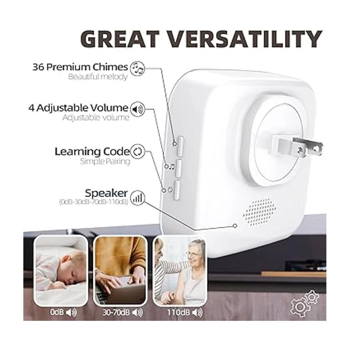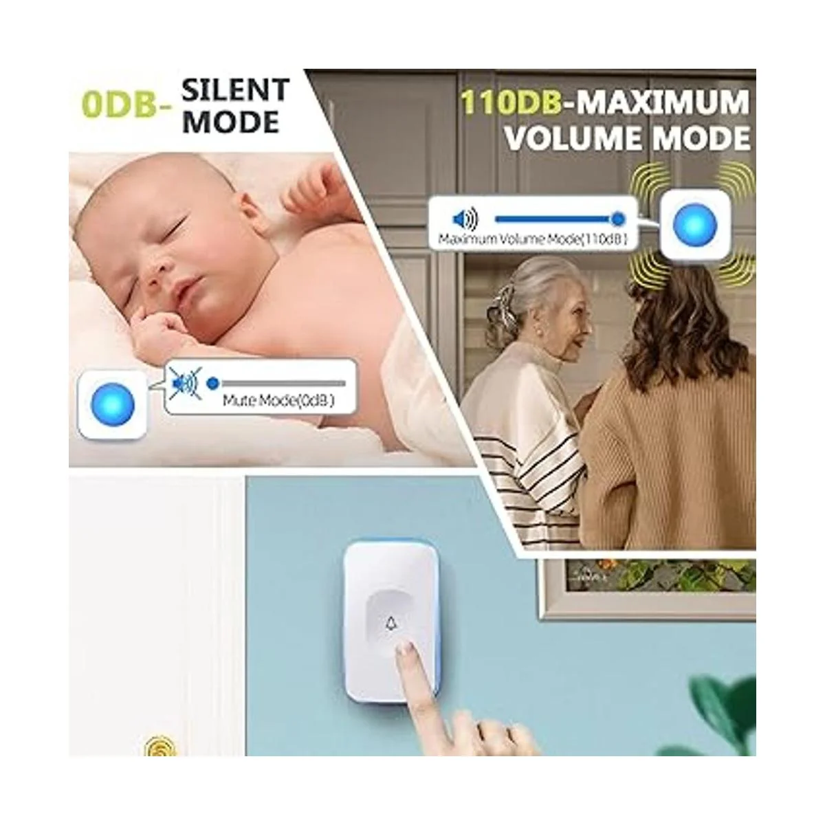 Timbre intermitente: el timbre inalámbrico tiene 36 tipos de música y 4 niveles de rango de volumen de 0 dB a 110 dB para satisfacer tus necesidades para diferentes ocasiones. Modo de silencio con luz intermitente que es fácil para las personas, incluyendo personas con discapacidad auditiva.