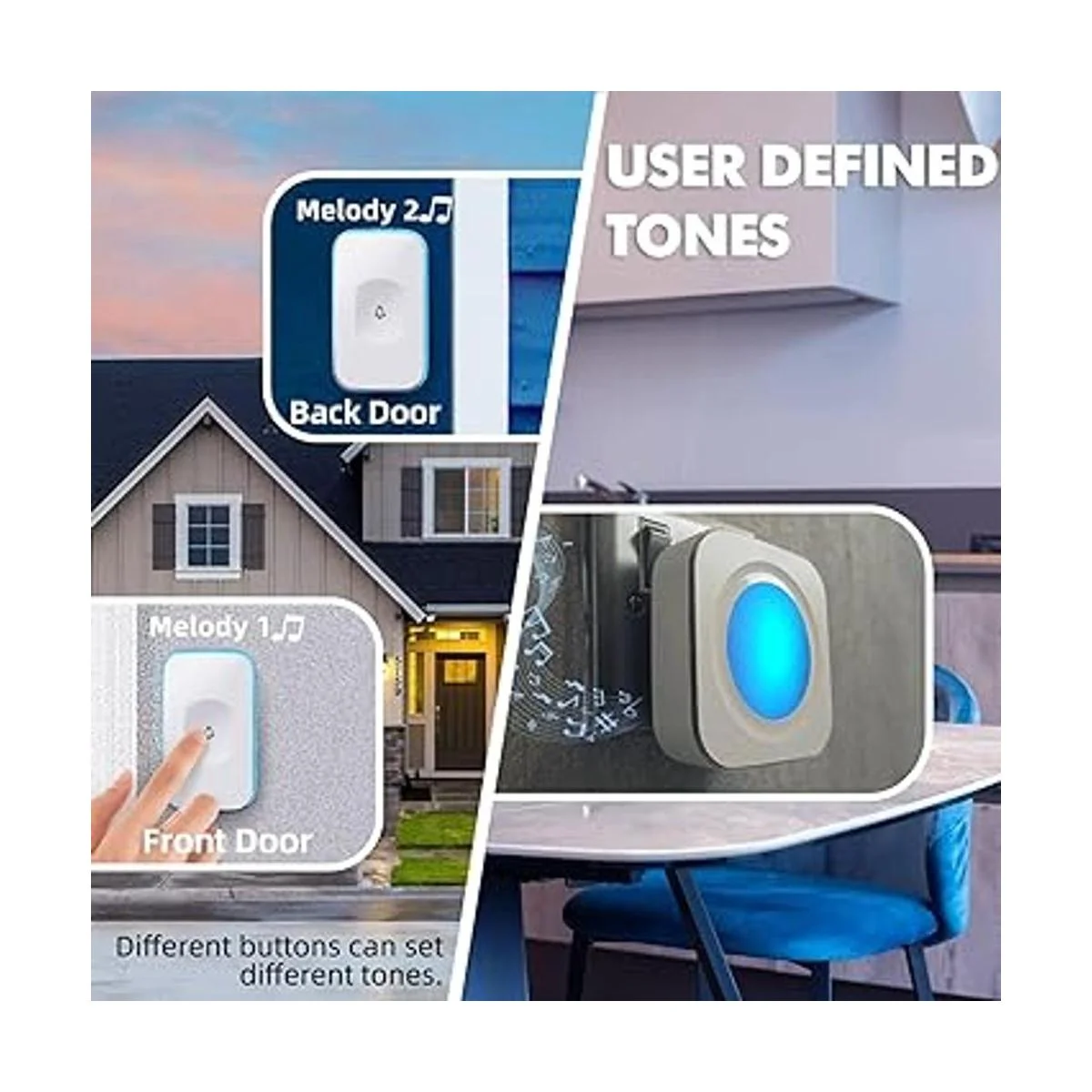 2 transmisores y 1 receptor: el timbre incluye dos botones de timbre que pueden establecer un tono de llamada diferente y niveles de volumen para cada transmisor para que puedas distinguir las puertas delanteras y traseras. Recuerda tu melodía anterior y nivel de volumen incluso después de un corte de energía