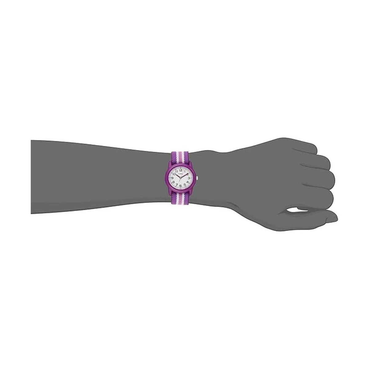 Adjustable purple 16 millimeter elastic fabric strap with pink stripe fits up to 6inch wrist circumference