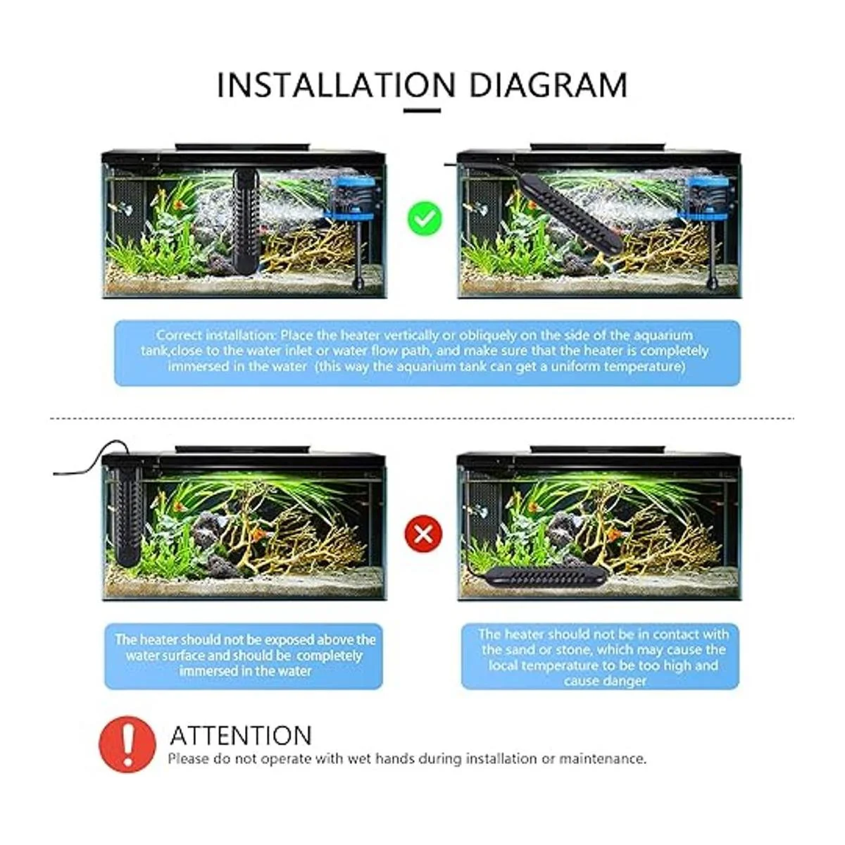 Tamaño aplicable del tanque de peces La gama adecuada de este calentador de peceras es de 800 W 100 210 galones 1200 W 150 300 galones, este calentador es adecuado para peceras de agua de mar y tanques de peces de agua dulce