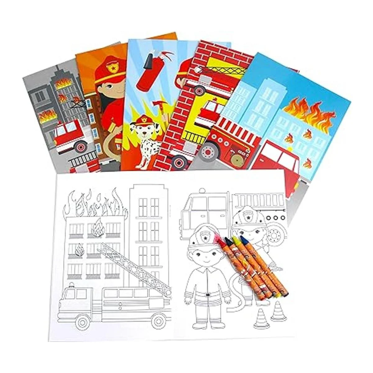 Tiny Mills Juego de 108 piezas de sobres para camiones de bomberos 12 bolsas grandes con asas, 24 sellos de tinta propia para niños, 12 hojas de adhesivos, 12 libros para colorear, 48 lápices de rayas