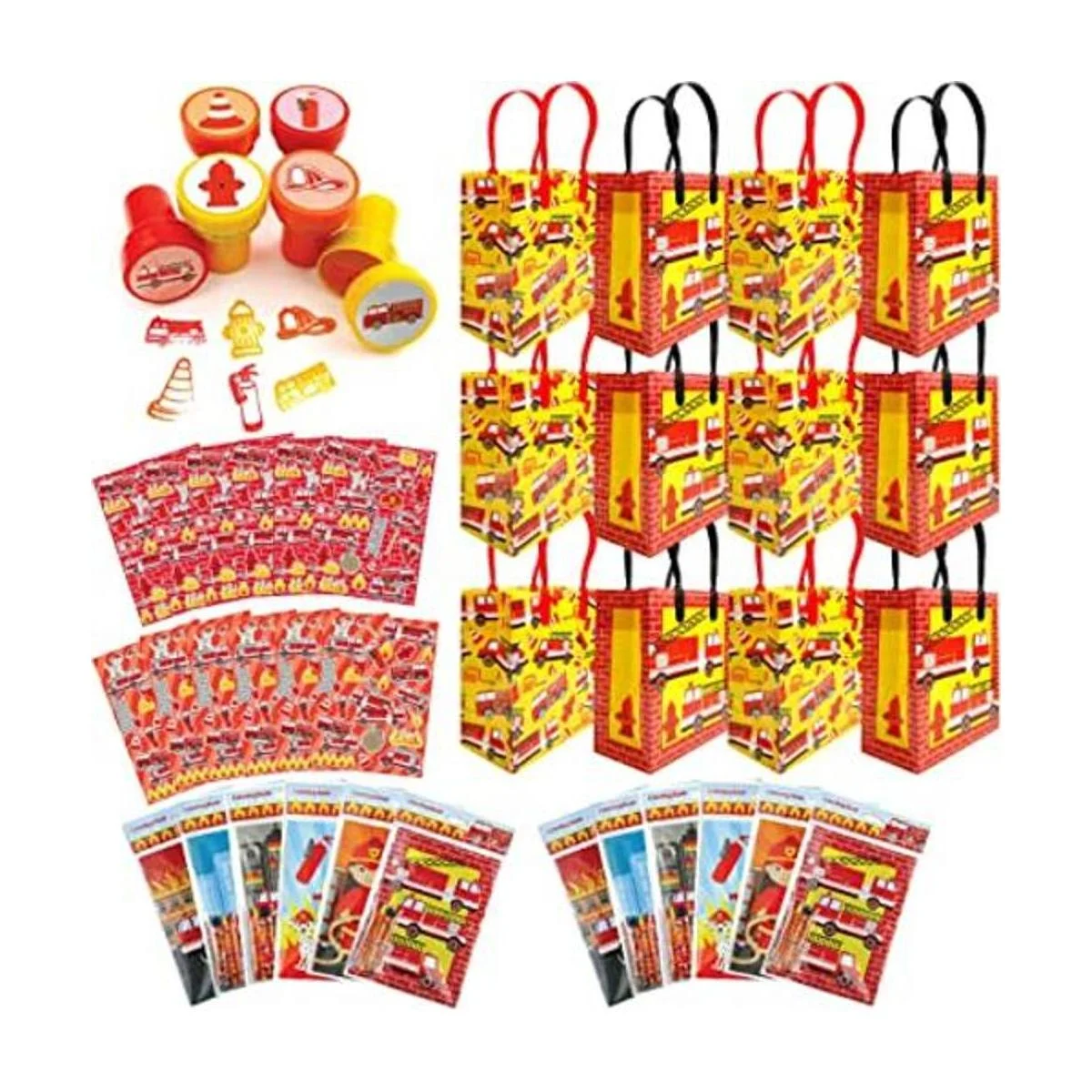 Total de 108 favores temáticos de camiones de bomberos Cada juego de regalos de fiesta viene con 12 bolsas grandes de regalo de fiesta con asas, 24 sellos de tinta para niños, 12 juegos de pegatinas, 12 libros para colorear con 48 lápices de colores. Perfecto para una fiesta de cumpleaños en coche