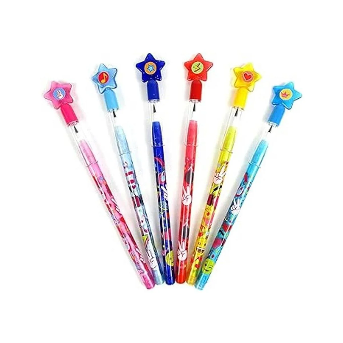 Cada lápiz incluye una parte superior de goma debajo de la tapa en forma de estrella