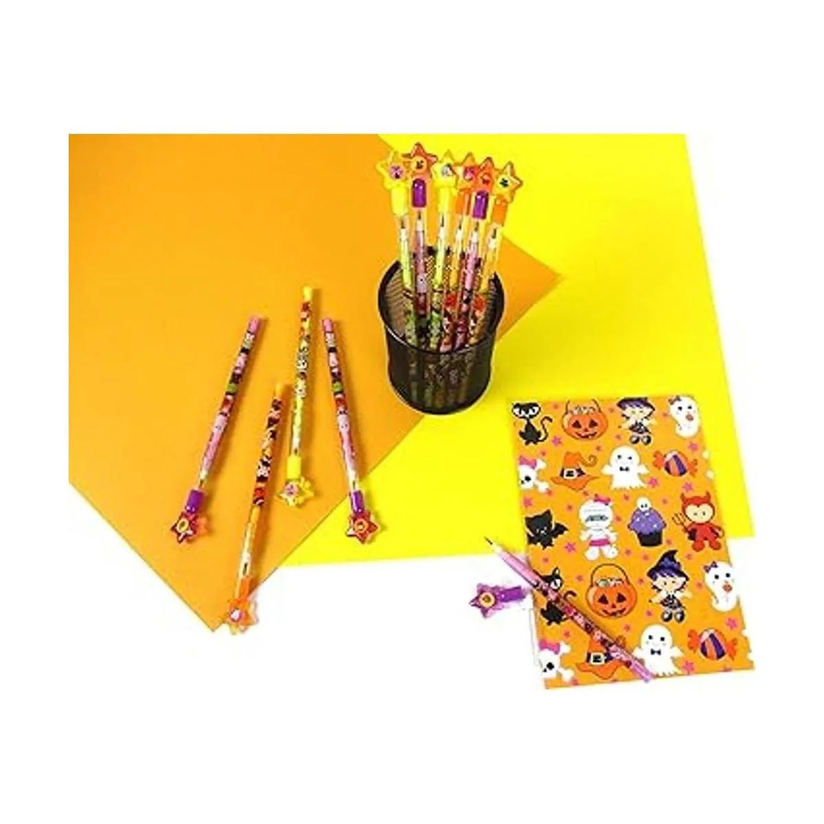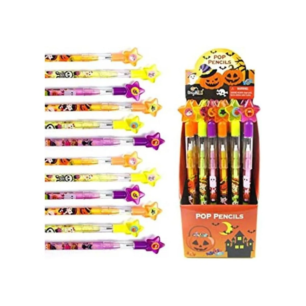 24 lápices de Halloween en 6 diseños festivos de Halloween y varios colores. Dulces de Halloween para fiestas de Halloween. Cada lápiz de empuje apilable para Halloween viene con 11 minas sin afilar y una bonita decoración con forma de estrella con diseño de pegatina de Halloween. La goma de borrar está debajo de cada decoración. Diseño apilable multipunto que no requiere un afilador