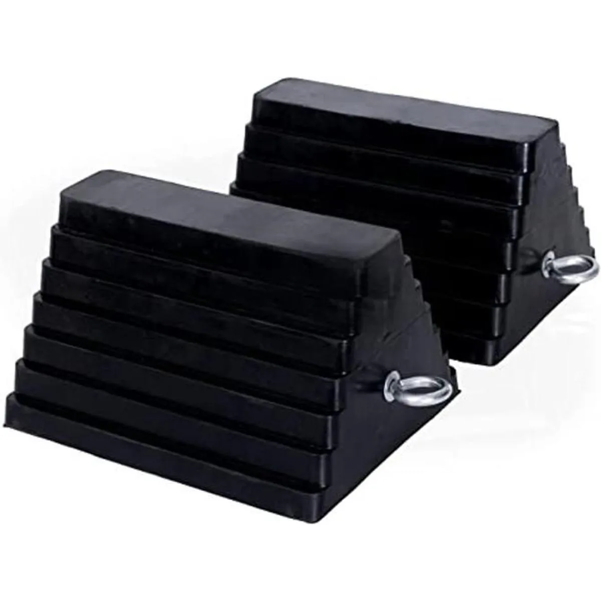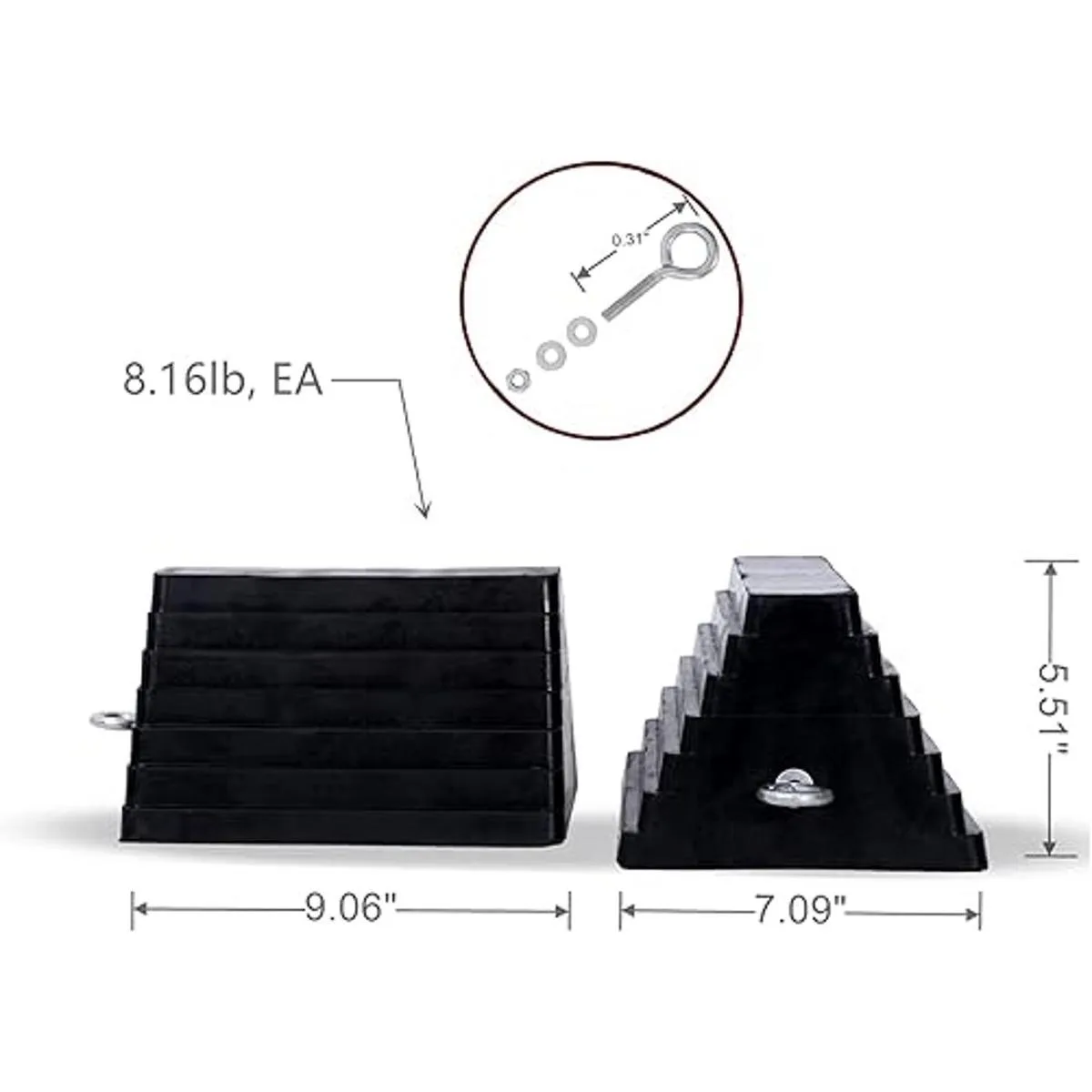 Tamaño universal: las calzas de rueda son bloques de rueda trapezoidales resistentes con diseño de perno de ojo extraíble, cada rueda de remolque mide 9.06 x 7.87 x 5.51 pulgadas, 2 unidades cada una de 8.16 libras