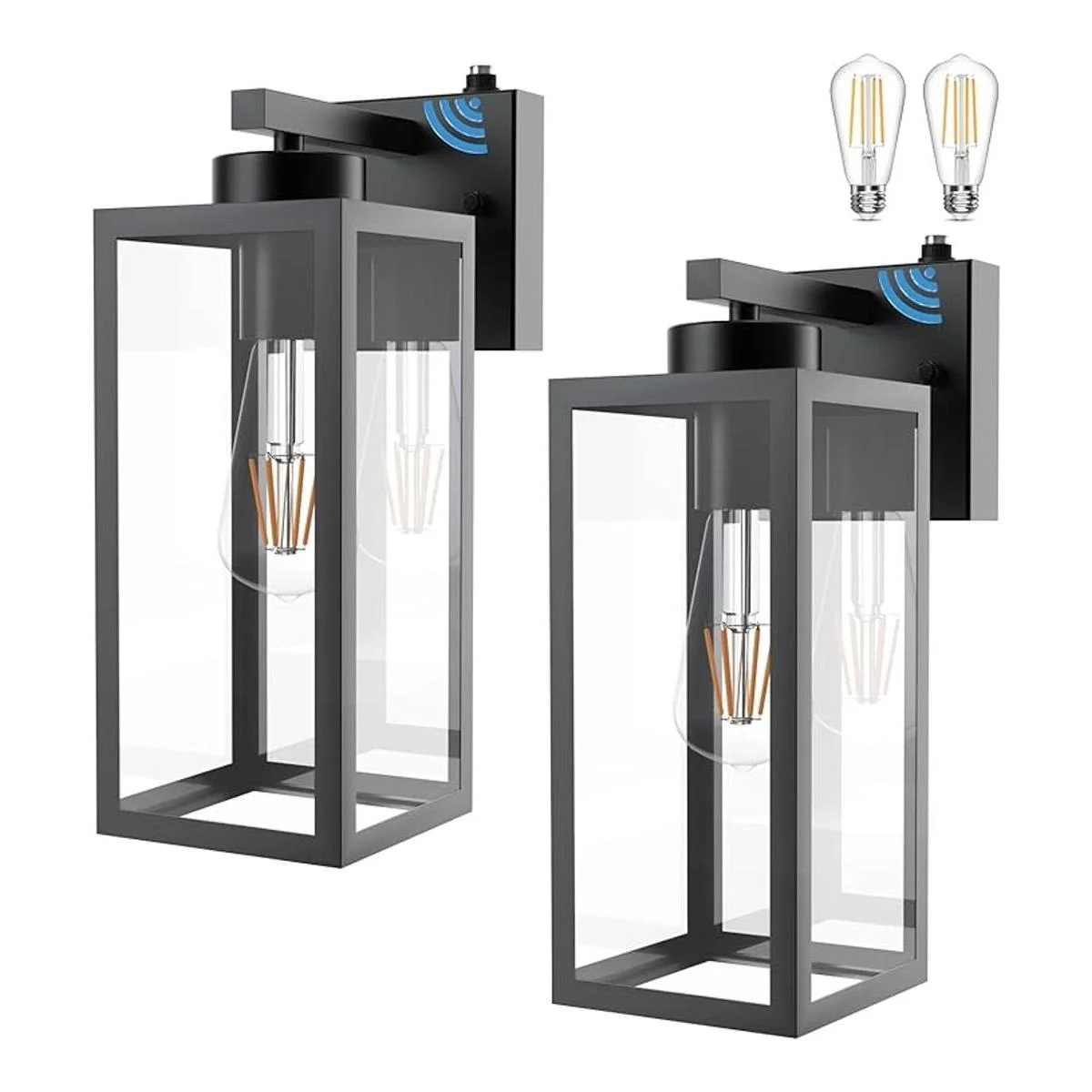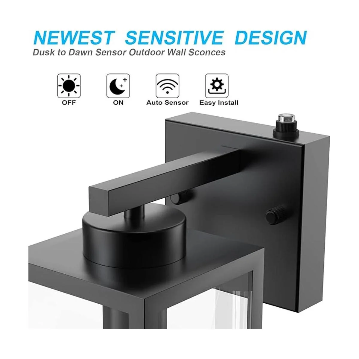 Tipace Paquete de 2 faroles de pared para exteriores con sensor del atardecer al amanecer, accesorios de luz exterior con sensor negro mate, aplique de pared exterior con pantalla de vidrio transparente bombillas E26 de 2700 K incluidas