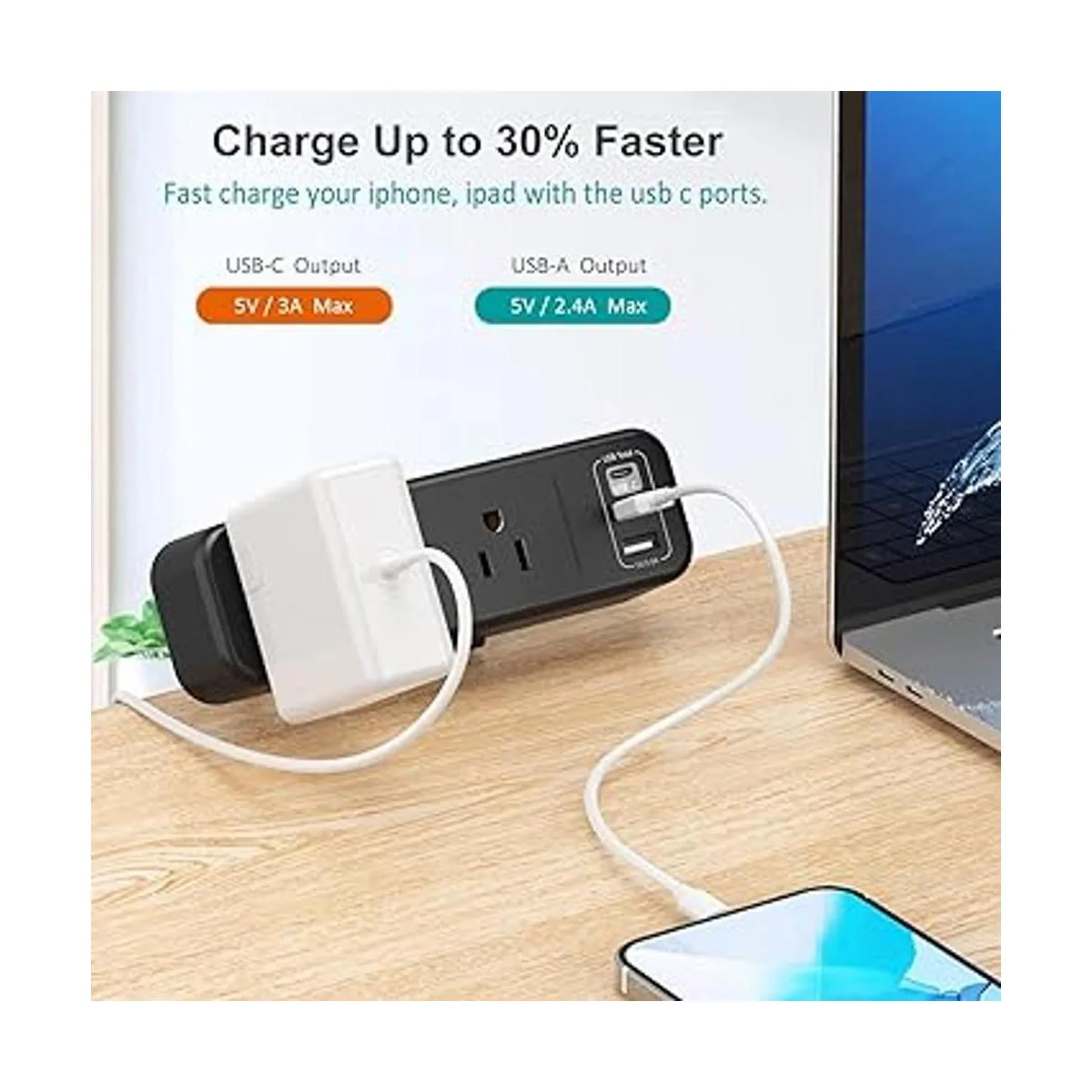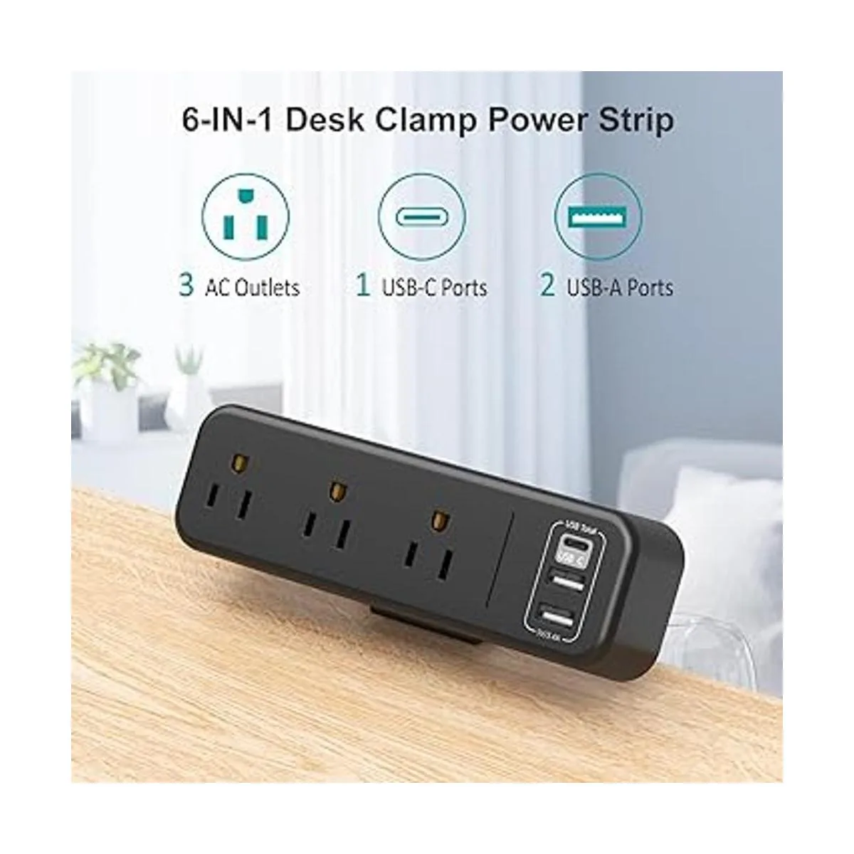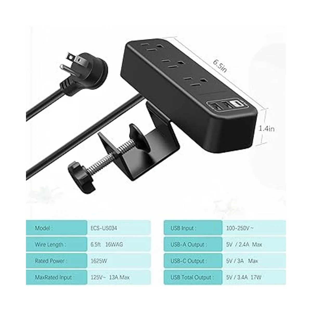 Tira de alimentación de escritorio 6 en 1: esta tira de alimentación de abrazadera de escritorio con 3 salidas de CA 1625 W/13 A, 2 puertos de carga USB A 5 V/2.4 A y 1 puerto de suministro de energía USB C 5 V/3 A. Cada puerto USB puede identificar su dispositivo de forma inteligente y busca maximizar su velocidad de carga.