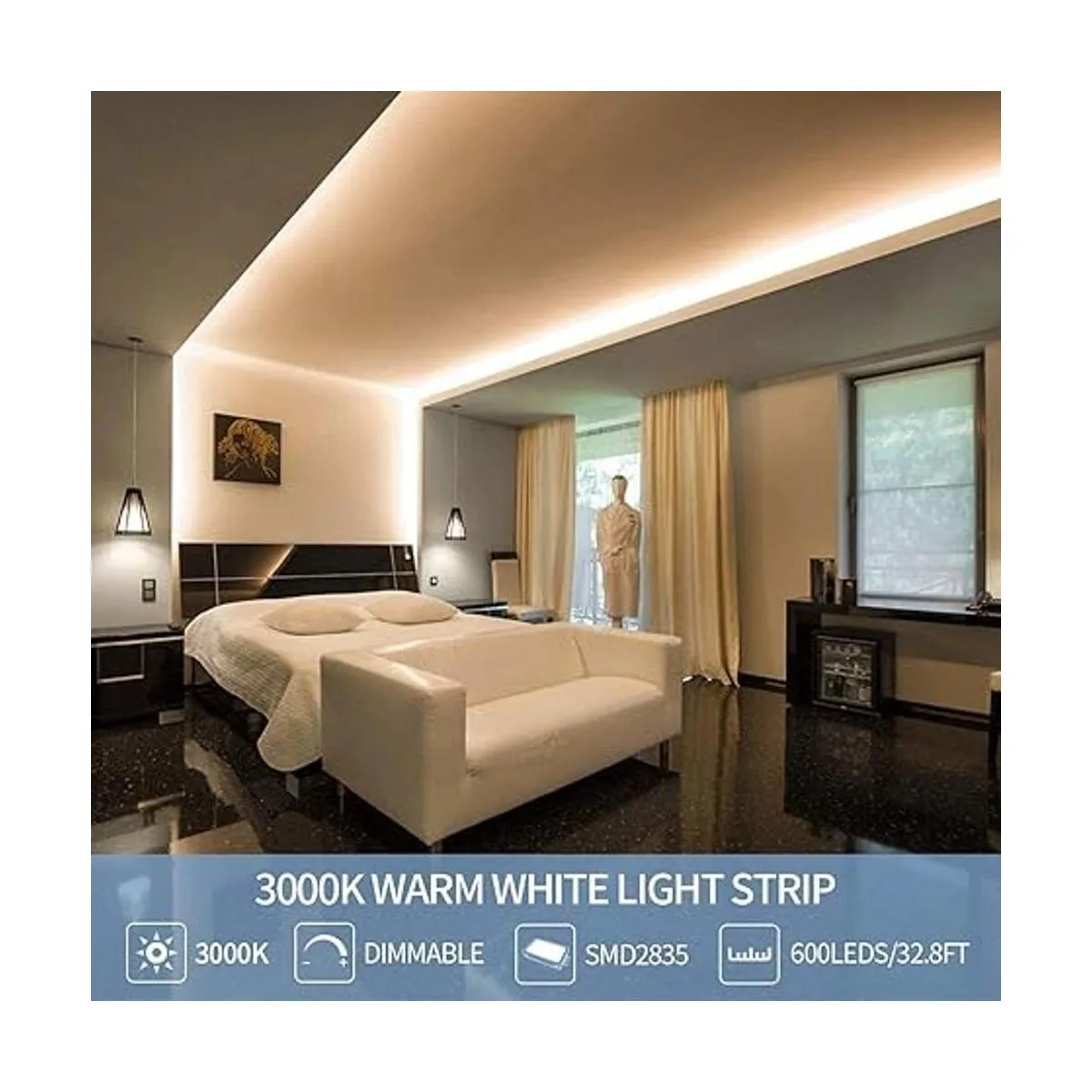 Tira de luces LED de 32.8 pies, luz blanca cálida tira de luces LED flexible, intensidad regulable Kits con fuente de alimentación ETL de 12V, clips adhesivos, interruptor de regulación de intensidad y conectores para decoración de interiores