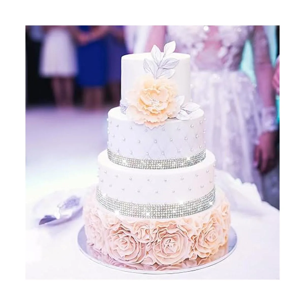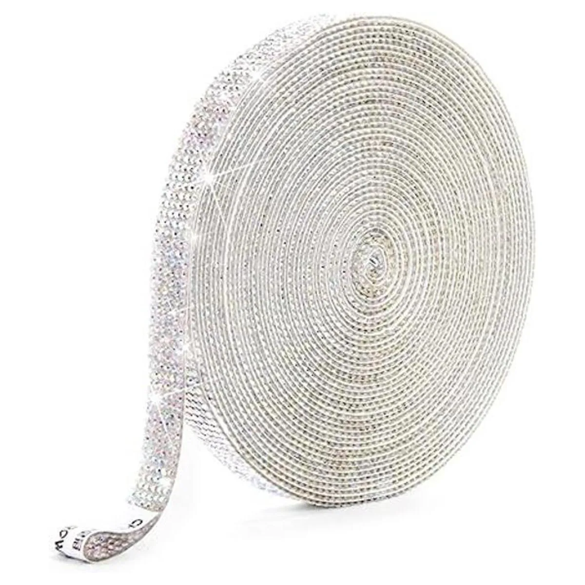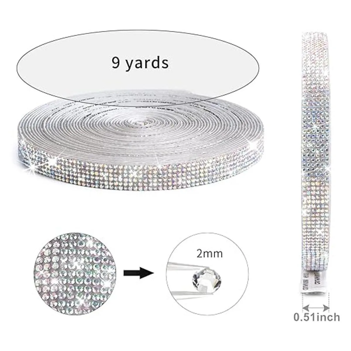 : el paquete incluye 1 rollo de cinta adhesiva de diamantes de imitación, 0.5 pulgadas de ancho y 9 yardas de largo, el área total es de 165 pulgadas cuadradas, 6 filas de diamantes de imitación de 0.079 in, más práctico. Puede haber un ligero olor después de recibir la mercancía, por favor, no te preocupes, es normal, simplemente déjala durante un tiempo.