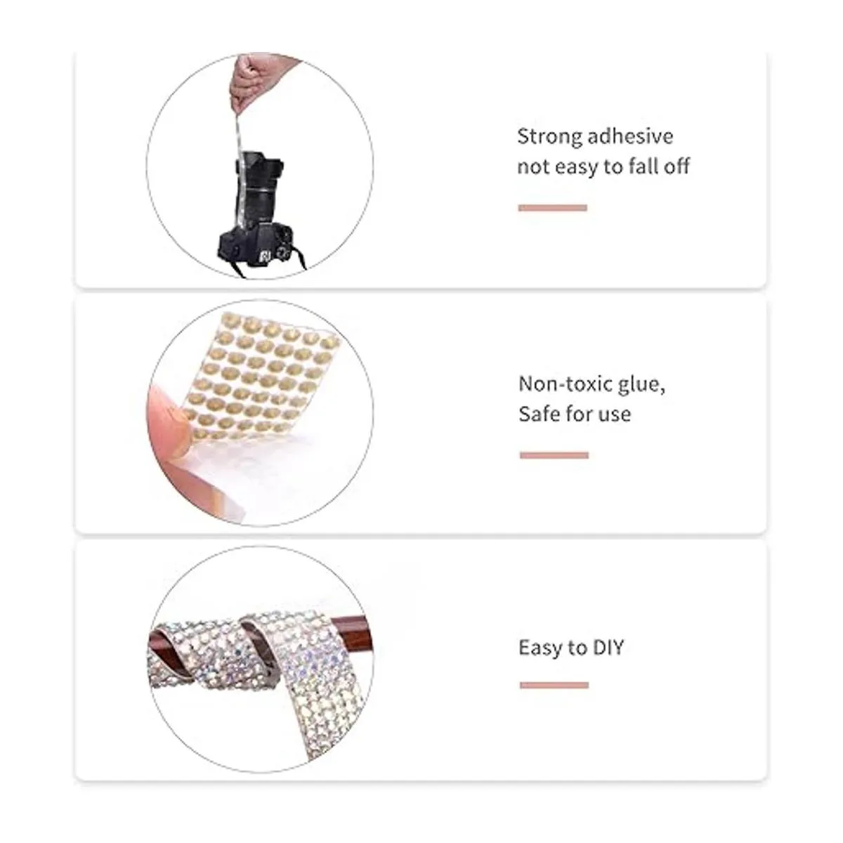 Súper pegajoso: el rollo de cinta de diamantes de imitación adopta tecnología de fusión en caliente de alta temperatura, combinado con diamantes de imitación de primera calidad y hecho de papel autoadhesivo, el adhesivo se adhiere extremadamente fuerte. Puedes pegar fácilmente esta cinta de diamantes de imitación en cualquier superficie lisa sin preocuparte por que se caiga, incluso en artículos que usas a menudo. Te ofrece un efecto brillante de larga duración.