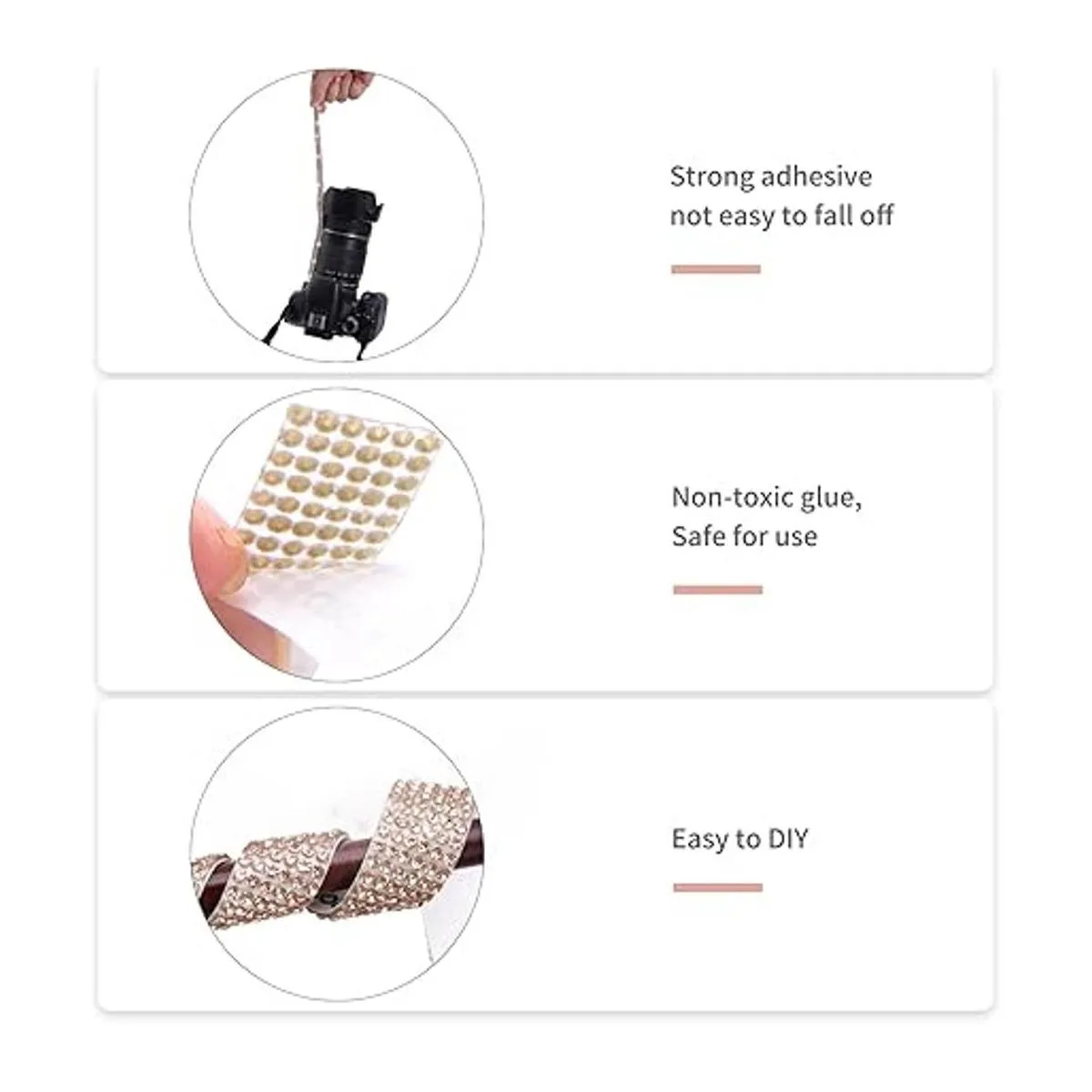 Súper pegajoso: el rollo de cinta de diamantes de imitación adopta tecnología de fusión en caliente de alta temperatura, combinado con diamantes de imitación de primera calidad y hecho de papel autoadhesivo, el adhesivo se adhiere extremadamente fuerte. Puedes pegar fácilmente esta cinta de diamantes de imitación en cualquier superficie lisa sin preocuparte por que se caiga, incluso en artículos que usas a menudo. Te ofrece un efecto brillante de larga duración.